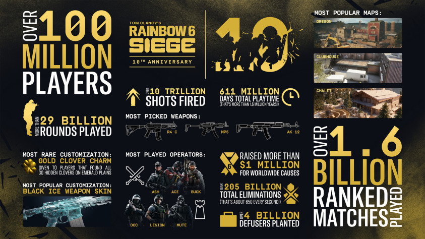 У Tom Clancy’s Rainbow Six Siege юбилей — 1 декабря онлайн-шутеру стукнуло 10 лет. По такому случаю Ubisoft поделилась любопытной инфографикой.