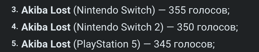 - Akiba Lost (Nintendo Switch 2) — 350 голосов;