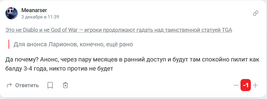 Изначально среди популярных версий встречались God of War, Diablo и The Elder Scrolls, но эти предположения отмели либо причастные к правообладателям люди, либо инсайдеры вроде Джейсона Шрайера (Jason Schreier). Теперь же в распоряжении заинтересованных появились сведения, указывающие на истинного владельца статуи.