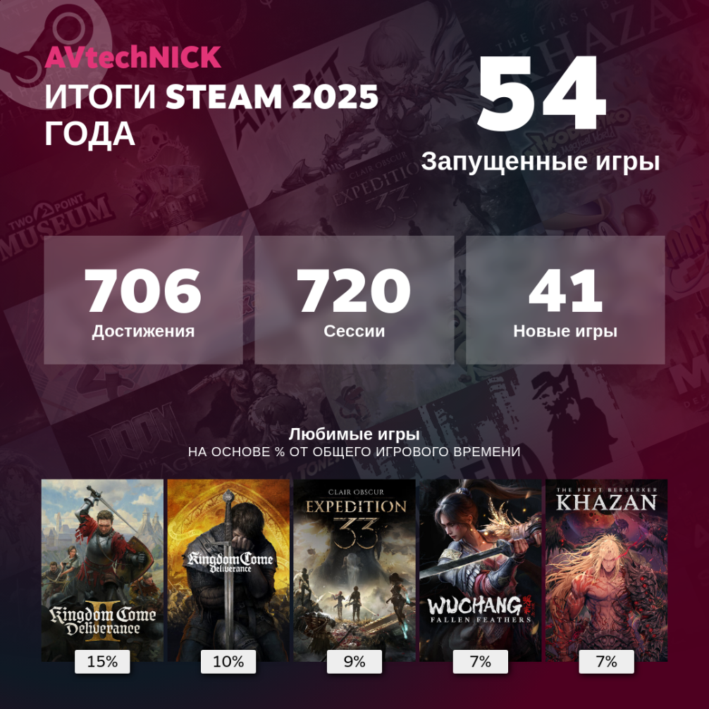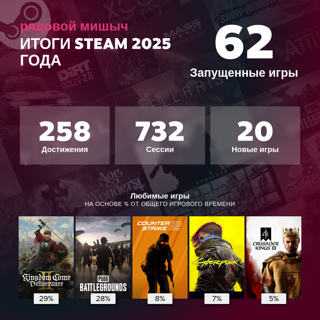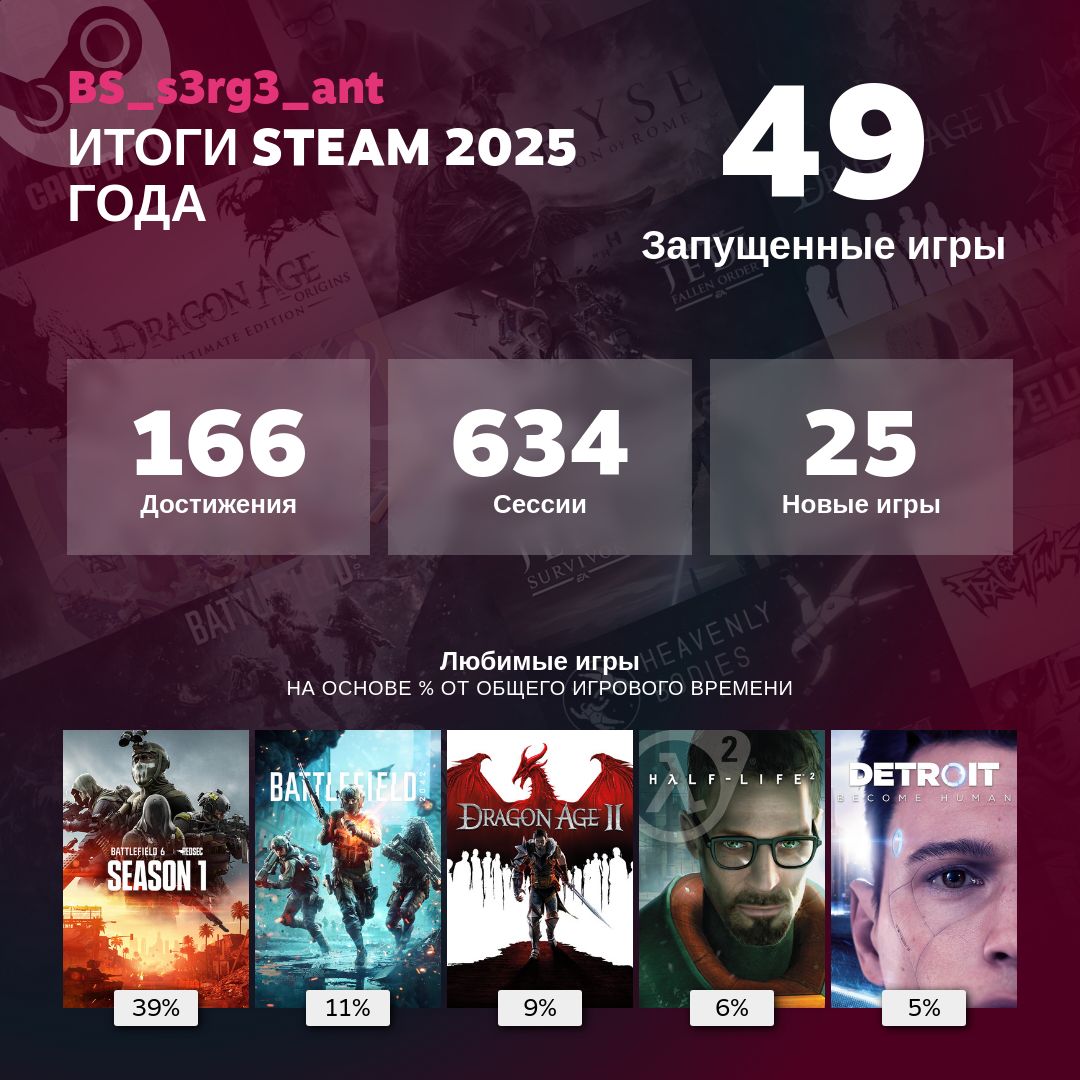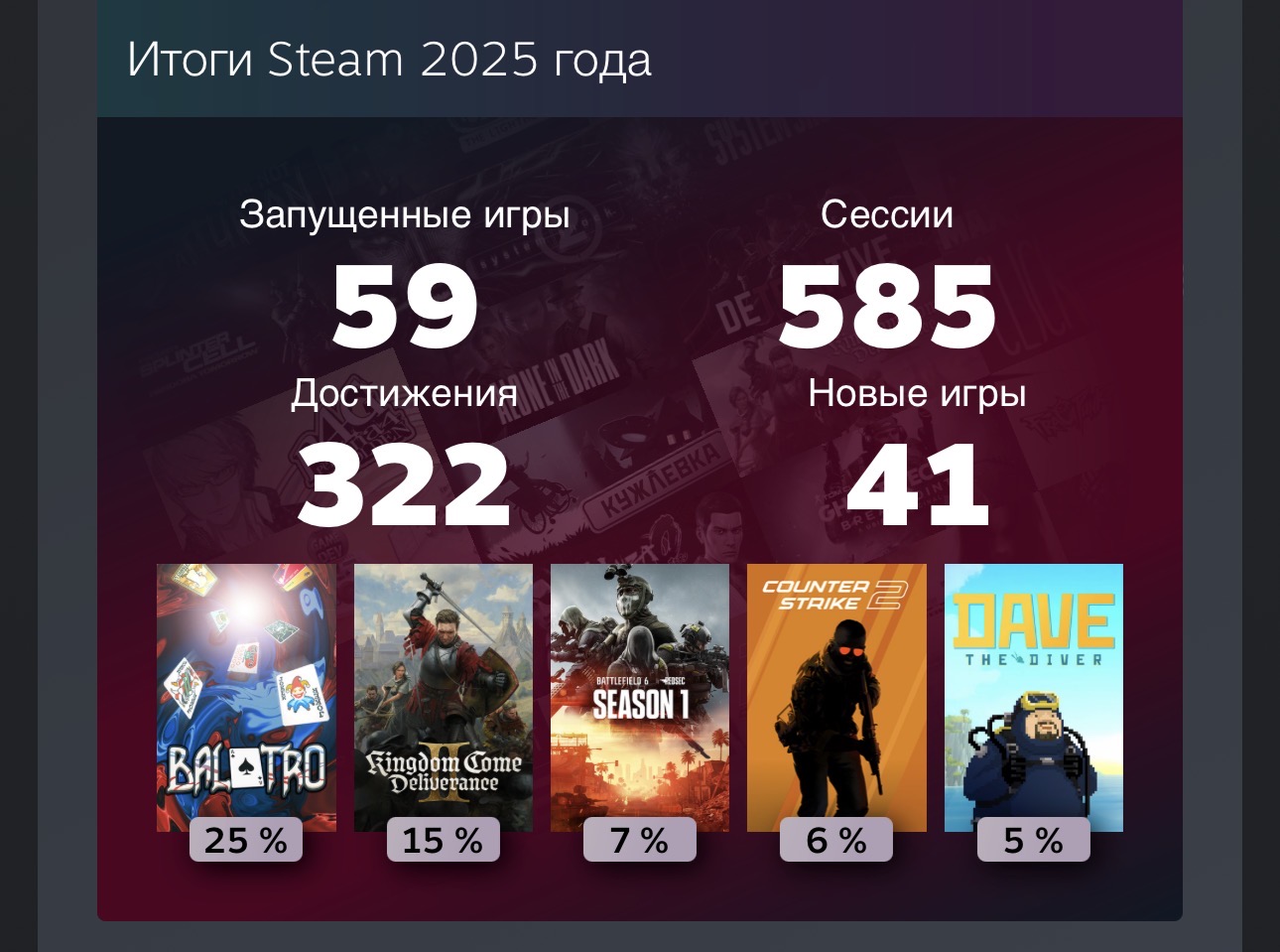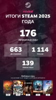 Музыкальные итоги года уже все подвели, верно? Теперь настал черёд игровых — Valve открыла специальную страницу, где геймеры могут ознакомиться с личными итогами 2025-го в Steam. Там собрана разная любопытная статистика, учитывающая промежуток с 1 января по 14 декабря текущего года.