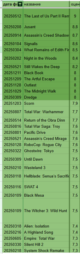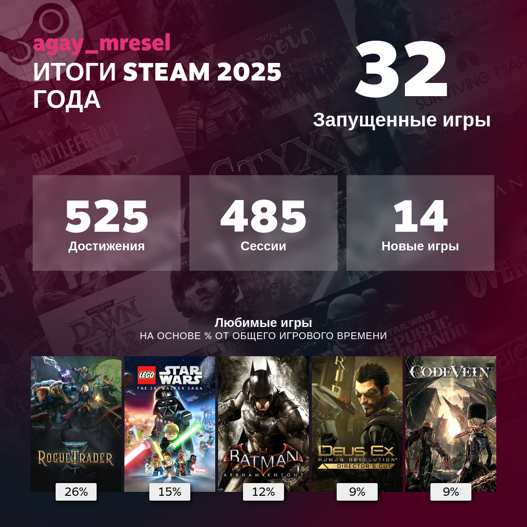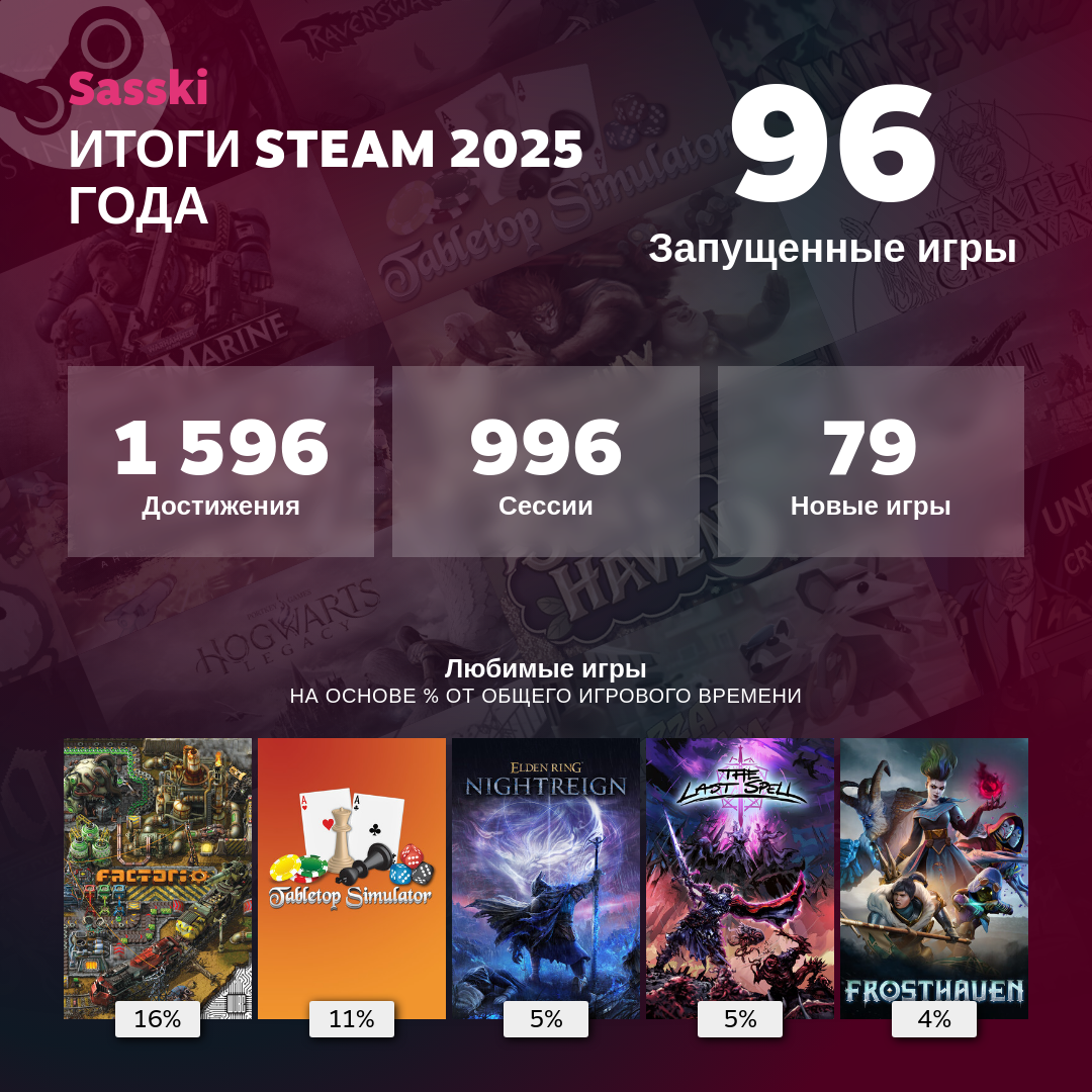 Так как мой год прошел, в основном, на консолях, то игры текущего года выглядят как-то так. Думаю, покупка Steam Deck увеличит количество пройденных игр в Steam в следующем году :)