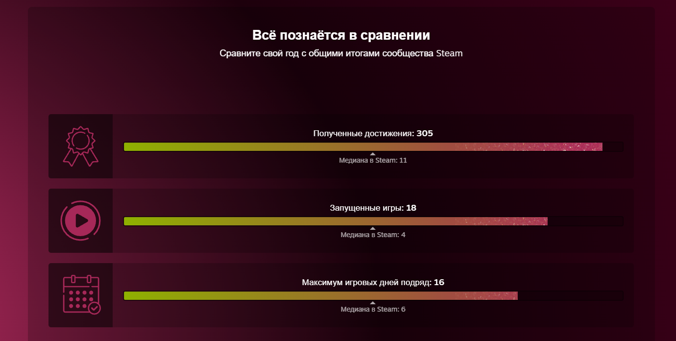 Для пользователей доступна информация о числе запущенных игр, количестве полученных достижений, максимальном «стрике» игровых дней и так далее. Свою статистику можно сравнить со средней по платформе и узнать, к примеру, больше или меньше вы запускаете игр, чем среднестатистический юзер Steam. Если у вас есть Steam Deck, в итогах года вам подсветят соответствующие данные.