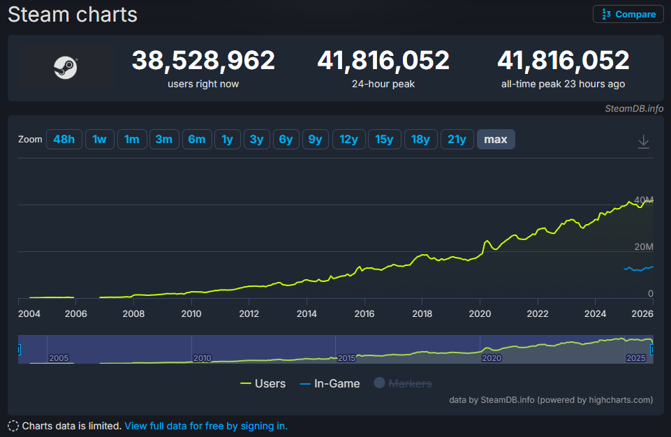 Напомним, предыдущий рекорд в 41,67 млн человек был достигнут в октябре прошлого года вскоре после релиза Battlefield 6. Таким образом, аудитория Steam продолжает стабильно расти. Ещё в 2020 году максимальный онлайн лишь слегка превышал отметку в 19 миллионов, а за весь 2024 год Steam обновил свой рекорд целых 7 раз.