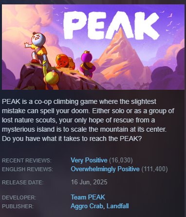 PEAK вышла в июне 2025 года и почти сразу стала сенсацией. За первые шесть дней игру купили более миллиона раз, а спустя девять дней продажи превысили два миллиона копий. На сегодняшний день проект разошёлся тиражом свыше 10 миллионов экземпляров и принёс более $55 миллионов выручки. Сам Каман признаёт, что во многом ему просто повезло.