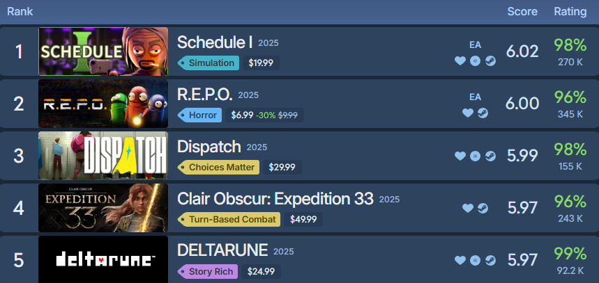 Аналитический ресурс Steam250 подвёл итоги своего традиционного топа лучших игр ушедшего года, где тайтлы расположены по рейтингу среди пользователей Steam. Сам рейтинг основан на средней оценке покупателей и количестве отзывов. На сей раз лидирующую позицию заняла кооперативная Schedule I.