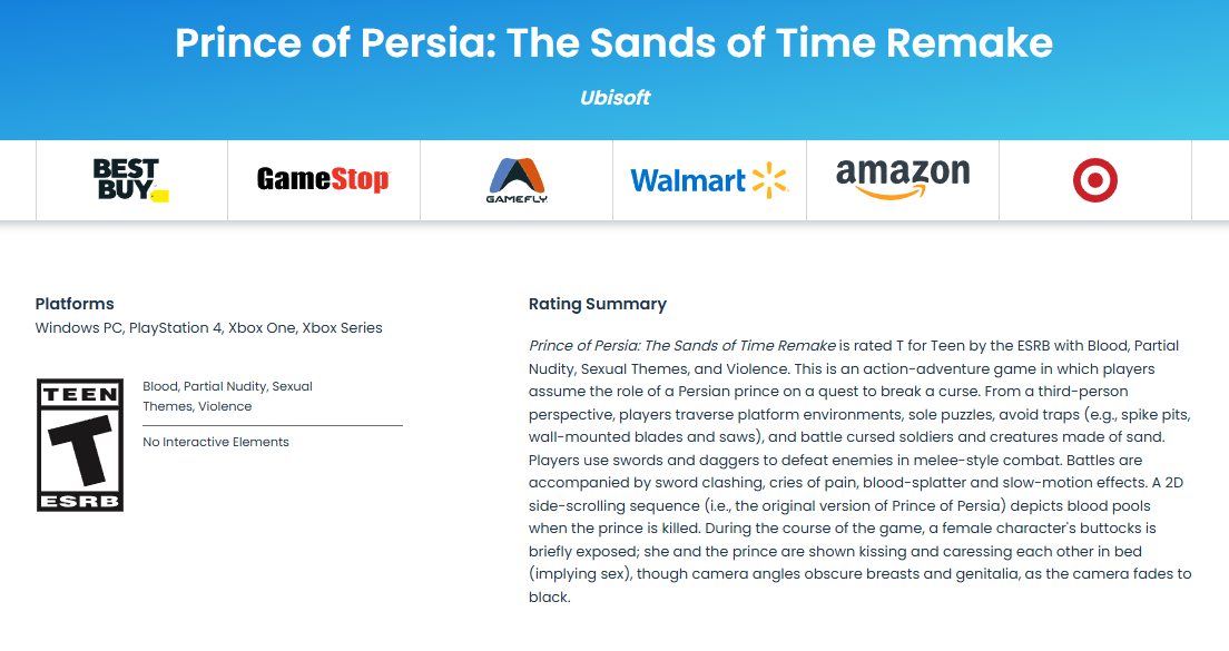 Ремейк Prince of Persia: Sands of Time удостоился подросткового рейтинга от ESRB за кровь, частичную обнажёнку, сексуальные темы и насилие. Это приключенческая игра, в которой игроки берут на себя роль персидского принца, пытающегося снять проклятие. Геймерам предстоит пройти через платформенные секции с видом от третьего лица, решить головоломки, избежать ловушки (например ядовитые шипы, настенные лезвия и пилы) и сразиться с проклятыми солдатами и существами, созданными из песка. Игроки используют мечи и кинжалы, чтобы побеждать врагов в ближнем бою. Сражения сопровождаются звоном клинков, криками боли, брызгами крови и слоумо-эффектами. В 2D-секциях (наподобие оригинальной Prince of Persia) появляются лужи крови, когда принц умирает…ESRB