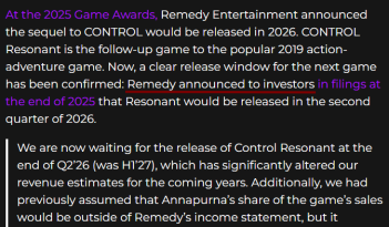 Только у Remedy нет такого отчёта от 15-го декабря 2025-го. А в тех что есть таких заявлений нет.