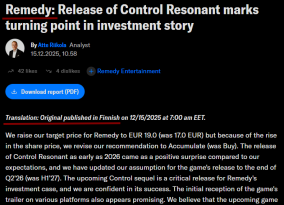 Стоило кнч проверить информацию по лучше. Это заявление не Remedy, а сторонний компании Inderes, которая не имеет отношения к Remedy и вставленная цитата не самих Remedy, а Атте Риикола, аналитика самой Inderes.