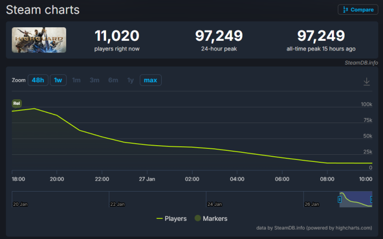 Доступ к Highguard для всех желающих открылся вечером 26 января. Уже через час после запуска пиковый онлайн в Steam почти достиг отметки в 100 тысяч одновременных игроков, но затем пошёл на спад. Причин у этого может быть несколько.