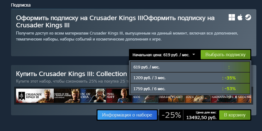 В Steam цены начинаются от 619 рублей в месяц. Также есть опции оформить подписку сразу на три месяца со скидкой 35 % (1 209 рублей) или на полгода со скидкой в 53 % (1 759 рублей). Напомним, полноценная покупка всех дополнений в настоящее время обойдётся в 13 тысяч рублей.