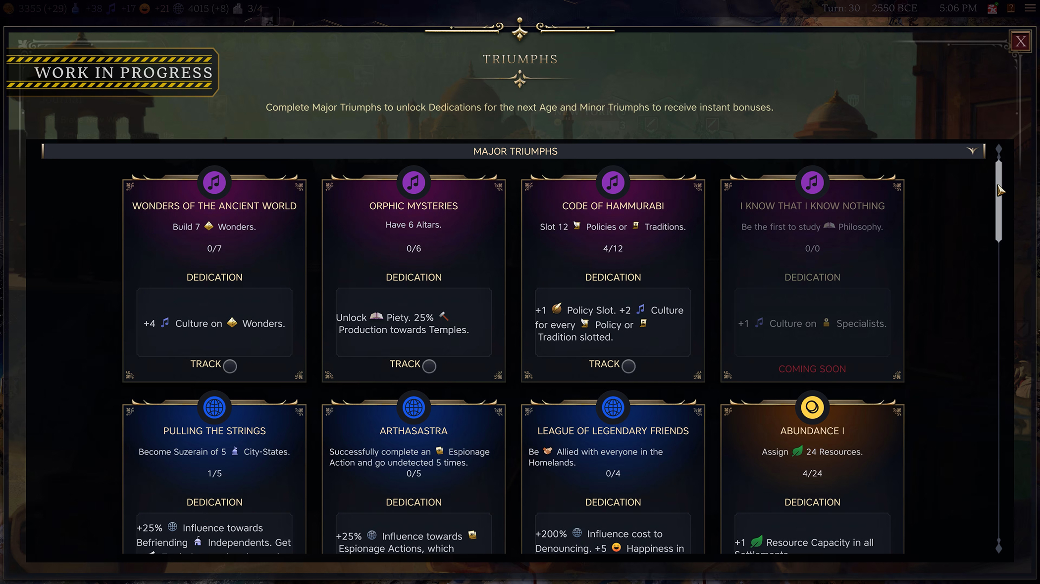 - «Главной претензией к [Путям наследия] было ощущение скованности, или, как часто писали игроки, „рельсовости“ Civilization VII», — сообщили в студии. Именно поэтому на смену этой системе придёт новая — так называемые Триумфы. Это набор дополнительных, амбициозных задач, которые делают каждую партию особенной. Каждый Триумф относится к одному из шести направлений развития: военному, культурному, научному, экономическому, дипломатическому или экспансионистскому.