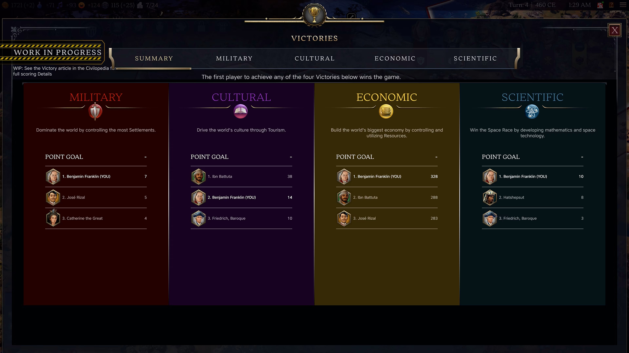 - Специалисты Firaxis переработают систему побед. Игроку будет необходимо достичь безоговорочного превосходства в одном из четырёх направлений: военном, экономическом, культурном или научном. Движение к победе начинается уже в Античности, а если игрок добьётся уверенного лидерства, то сможете одержать победу невероятно рано — даже в эпоху Исследований.
