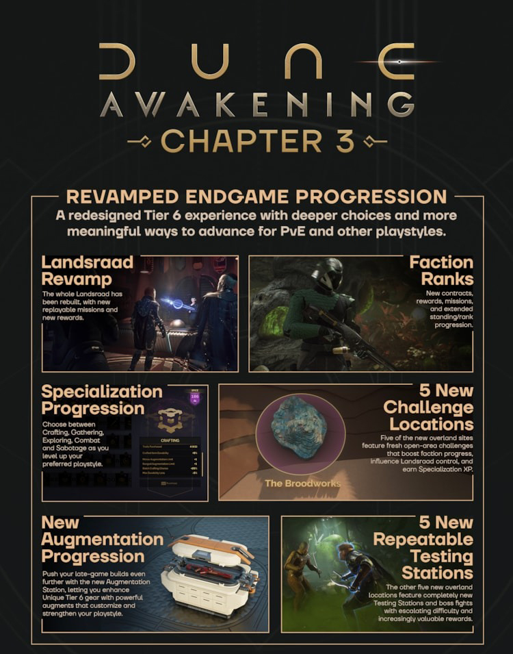 - Геймеры часто жалуются, что эндгейм в Dune: Awakening пустоват. Исправить это призвана третья глава. Разработчики изменили систему Ландсраада, благодаря которой у игроков появится больше заданий, новые награды и возможности выбирать понравившийся стиль игры. Пользователи смогут самостоятельно выбирать поручения, которые позволят зарабатывать репутацию во фракции, завоёвывать расположение Великих домов и получать опыт для специализаций.
