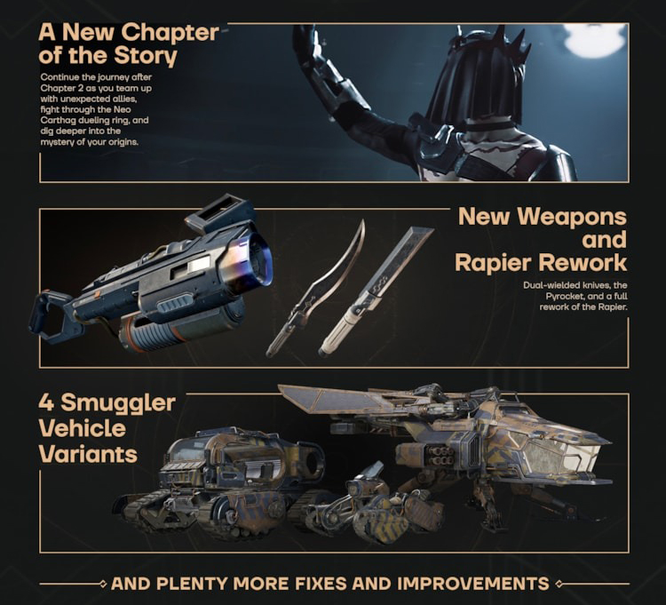 - Новый сюжетный контент — история в третьей главе продолжится с того же места, где завершилась вторая глава. Сражайтесь на арене в Новом Карфаге и найдите неожиданных союзников, которые помогут раскрыть тайну вашего происхождения.