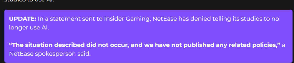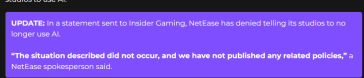 По словам Суды, изначально у NetEase был отдел, занимавшийся исследованиями и разработкой в области искусственного интеллекта, однако со временем компания разочаровалась в новых технологиях и решила отбросить их, заодно велев своим студиям «вообще не связываться с ИИ». Суда добавил, что не знает точной причины такого исхода, но предполагает, что их может быть две — во-первых, подавляющему большинству геймеров не нравится искусственный интеллект и его применение в играх, а во-вторых, свою роль играют проблемы с нарушением авторских прав.