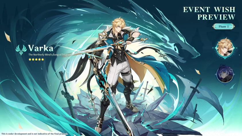 Новичком патча выступит великий магистр Ордо Фавониус по имени Варка. Он владеет Глазом Бога Анемо и предпочитает двуручные мечи. Причём размахивать он может сразу двумя такими клинками, благодаря чему способен наносить два типа элементального урона одновременно. Используя элементальный навык, Варка преобразует урон правого меча в Пиро, Гидро, Электро или Крио урон в зависимости от элементального типа его союзников, а урон левого меча — в Анемо урон.