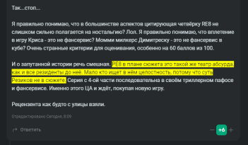 Я правильно понимаю, что в большинстве аспектов цитирующая четвёрку RE8 не слишком сильно полагается на ностальгию? Лол. Я правильно понимаю, что вплетение в игру Криса - это не фансервис? Момми милкерс Димитреску - это не фансервис в кубе? Очень странные критерии для оценивания, особенно на 60 баллов из 100.