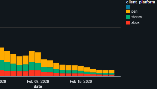 - В последнее время крупнейшая аудитория была на PlayStation 5 — она оказалась примерно вдвое больше, чем на других платформах. На втором месте Xbox Series, а замыкает список Steam.