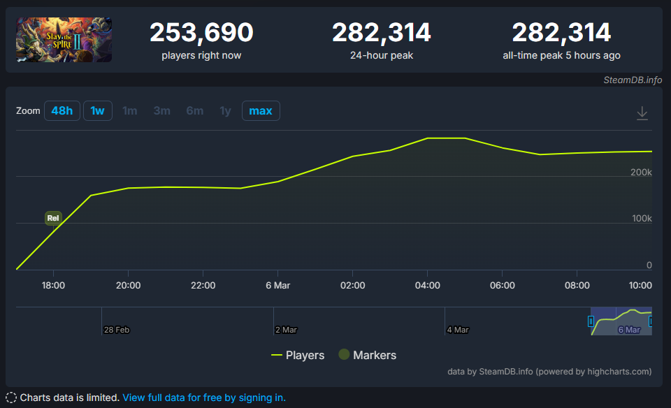 Однако на этом Slay the Spire 2 не остановилась, и число одновременных игроков продолжало расти, пока не добралось до отметки в 282 тысячи геймеров [Дополнение от 18:58 МСК. Уже больше 430 тысяч геймеров!]. Результат первой Slay the Spire — только 57 тысяч человек. Когда она запустилась в 2017 году, на старте у неё было всего 193 пользователя в пике, напомнили разработчики из Mega Crit.