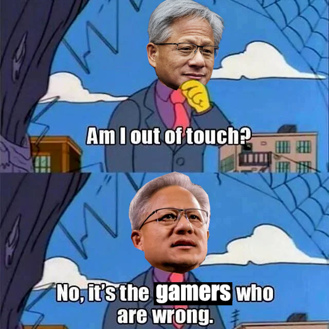Я не хочу полностью ругать технологию - да, текущии примеры отвратительны, и даже если местами игра выглядит лучше, в целом все очень плохо. Но в хороших руках это может выглядеть хорошо, + все идет к дальнейшему употреблению нейросетей в рендеринге графики в играх, тот же ПС6 строят с учетом этого. Но над этим еще работать и работать, а показывать явно сырой результат, утверждая при этом, что все все неправильно поняли? Все правильно поняли, Дженсену нужно больше денег от инвесторов.