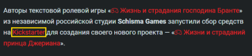 Авторы текстовой ролевой игры « Жизнь и страдания господина Бранте» из независимой российской студии Schisma Games запустили сбор средств на Kickstarter для создания своего нового проекта — « Жизни и страданий принца Джериана».