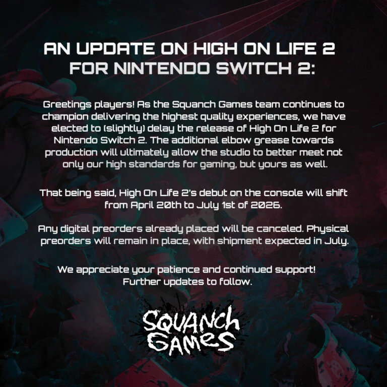 Приветствуем вас, игроки! Команда Squanch Games продолжает стремиться к высочайшему качеству игр, поэтому мы решили (немного) отложить запуск High On Life 2 на Nintendo Switch 2. Приложенные к разработке дополнительные усилия в конечном итоге позволят студии не только соответствовать высоким стандартам, но и оправдать ваши ожидания.