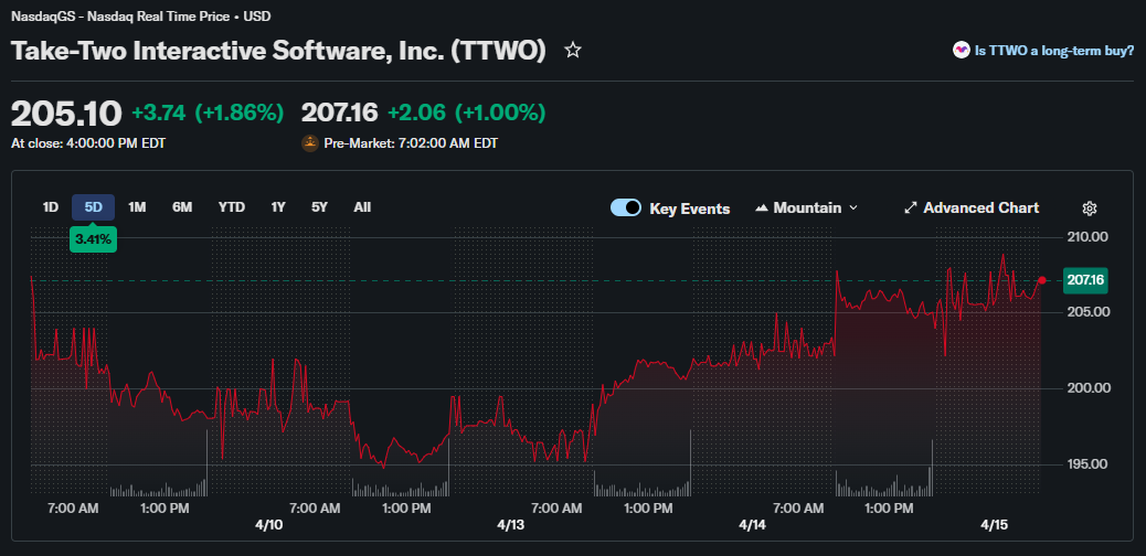 После таких откровений неудивительно, что акции Take-Two поползли вверх. Торги открылись на уровне около 202 долларов за акцию, а затем подросли до 208 долларов за штуку и стабилизировались на отметке 205 долларов за акцию. Но даже такой небольшой прибавки хватило, чтобы рыночная капитализация увеличилась примерно на миллиард долларов.
