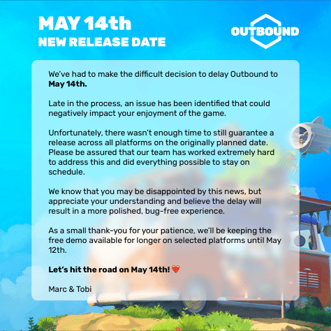 Дополнительные недели потребуются, чтобы разгладить несколько серьёзных ухабов, обнаруженных на пути Outbound. Как сообщили разработчики, на финальном этапе разработки нашли проблему, которая могла бы серьёзно испортить пользователям впечатление от игры. Команда приложила максимум усилий, чтобы попытаться починить всё в срок, но порыв не увенчался успехом.