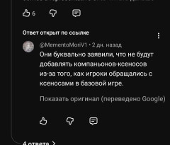 "Слышал от человека, что разрабы заявляли, что не будут делать ксеносов-компаньонов в длс из-за того, как игроки к ним относились в основной игре."
