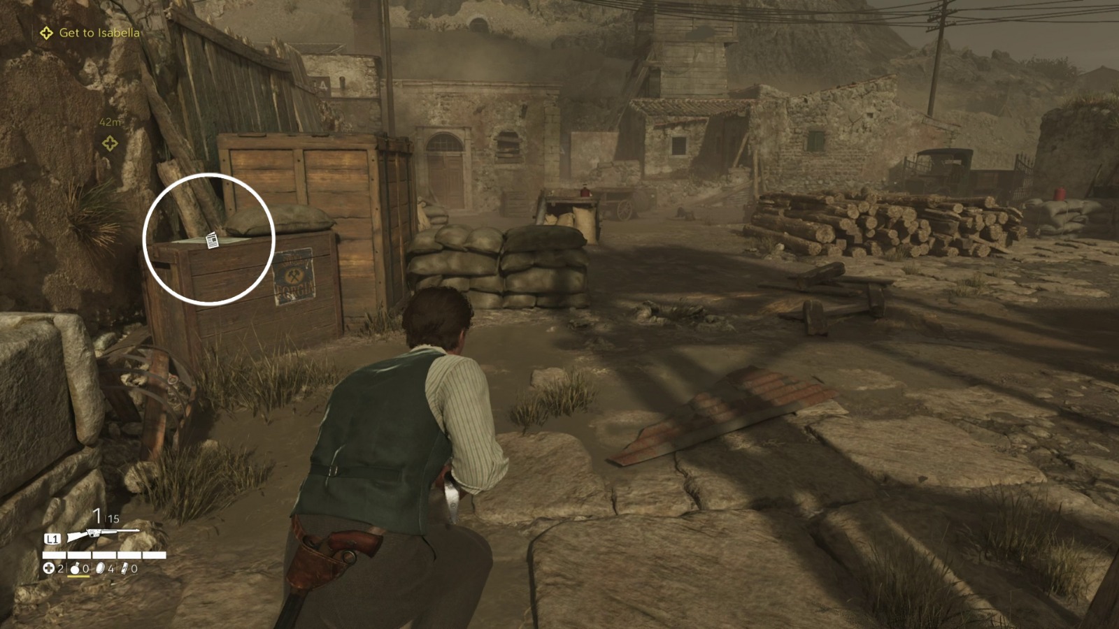 На одном из деревянных столбов прикреплена записка, а возле выхода лежит бинт, который пригодится, если нужно перевязать Энцо после боя с Чезаре. Снаружи найдите убитого мафиози. Рядом лежат пистолет и дробовик — возьмите их, они вам пригодятся! Заберитесь на ближайший уступ. Оказавшись наверху, сразу займите укрытие — сюда вскоре придёт множество охранников. Будьте осторожны: под шквалом огня некоторые деревянные ящики могут развалиться, поэтому используйте их только в крайнем случае и быстро перебегайте к следующему укрытию.
