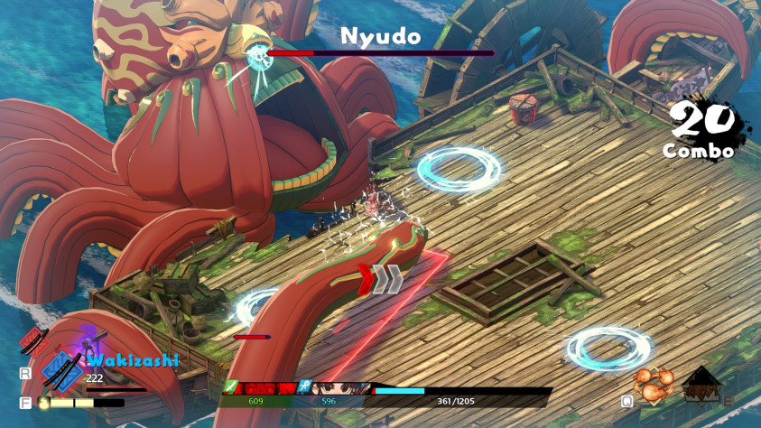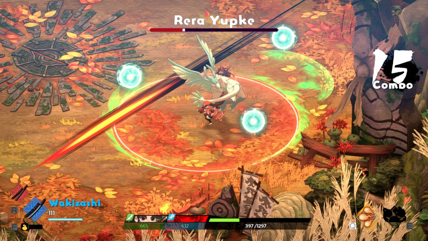 Кроме того, Цуруги, то есть атакующий персонаж, орудует сразу двумя мечами — хондзаси и вакидзаси. Каждый клинок имеет свой запас прочности, и после его опустошения падает урон, поэтому мы вынуждены постоянно переключаться между мечами — под этот приём выделен отдельный вид урона. Вроде бы интересные механики, но получается, что в сражениях нужно следить за несколькими дополнительными факторами — тут и смена клинков, и не очень удобный поначалу контроль за бойцом поддержки и его заклинаниями. В итоге к боевой системе, скажем так, нужно привыкнуть. А у кого-то, возможно, так и не получится синхронизироваться с ней и войти в поток.