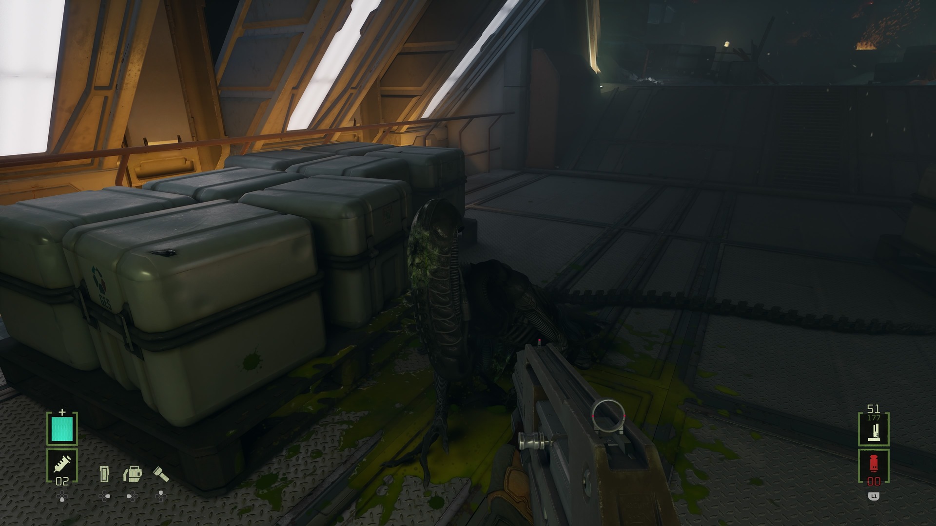 И вот тут, например прекрасно видно, что эффект от попадания в чужого околонулевой. Не ясно толи это от чужого искры, будто он металлический, либо это просто трассер от пули. Но никакой зеленой крови-кислоты нет и в помине. Только при смерти немножечко появилось.