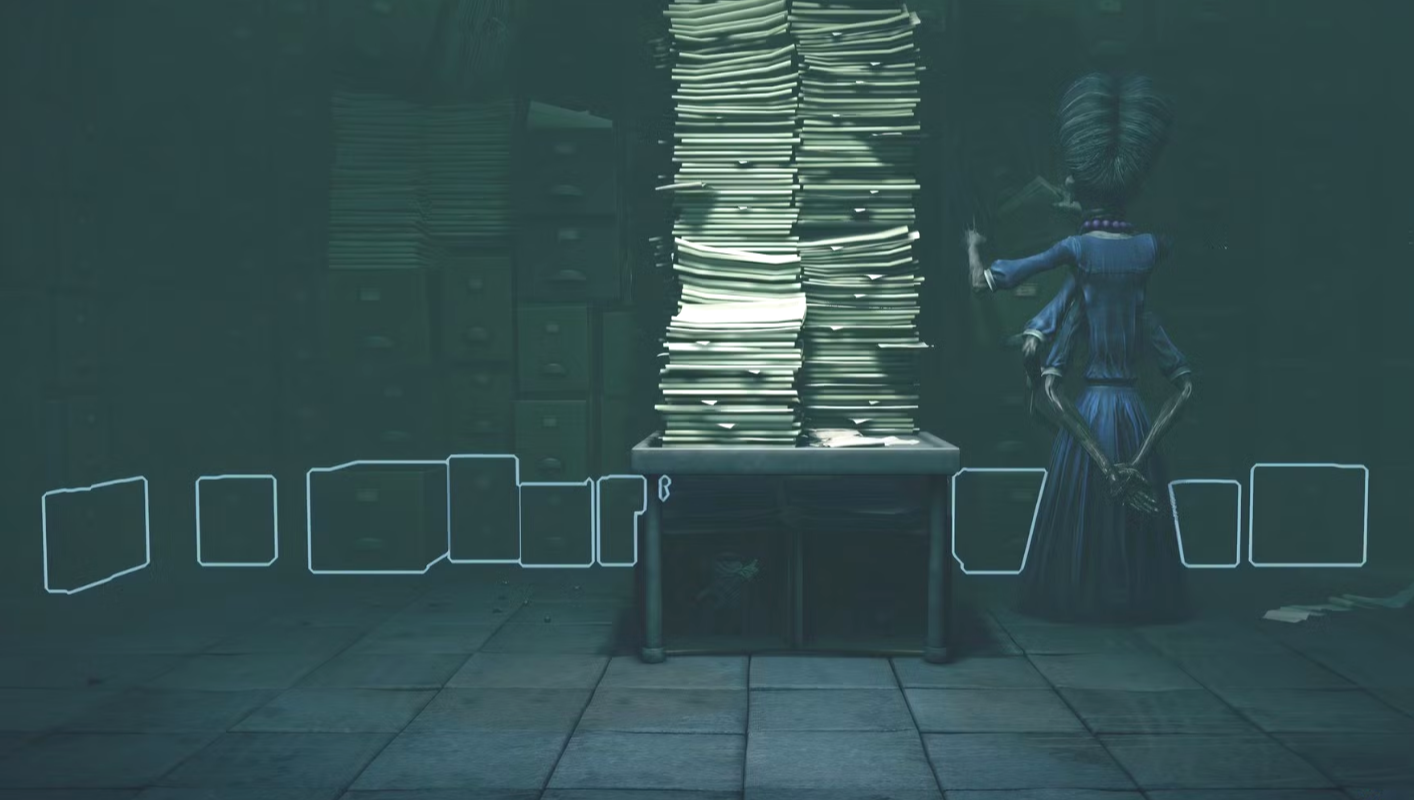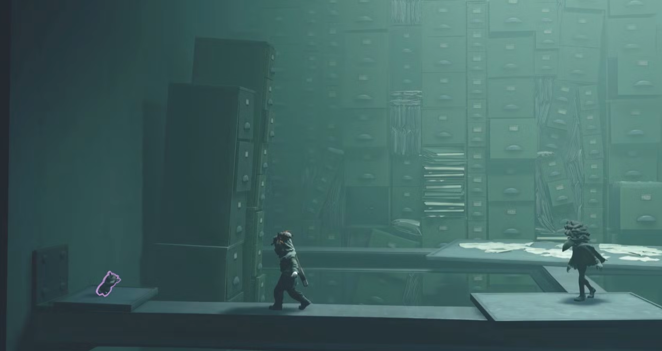 Ещё несколько движений, и она наконец выйдет через дверь с правой стороны, а вы сможете проследовать за ней. Этот путь ведёт в коридор с портретами и стоящей в самом конце передвижной тележкой. Подкатите тележку к стойке с правой стороны и продолжите движение в следующую комнату. Не подходите слишком близко к проводу под напряжением, пока Малой не нажмёт кнопку, чтобы отключить электричество. Следующая комната будет большой, здесь есть несколько картотек. Как и в кабинете ранее, в данное помещение вновь войдёт Начальница, которая будет медленно ходить туда-сюда между левой и правой сторонами. Вам нужно пробраться мимо босса тем же способом, что и раньше: сначала переместитесь к середине комнаты, а затем — к правому дальнему краю, где сразу же обнаружите лестницу. Продолжаем прохождение второй главы Little Nightmares 3 со всеми коллекционными предметами на сайте StopGame.Ru.