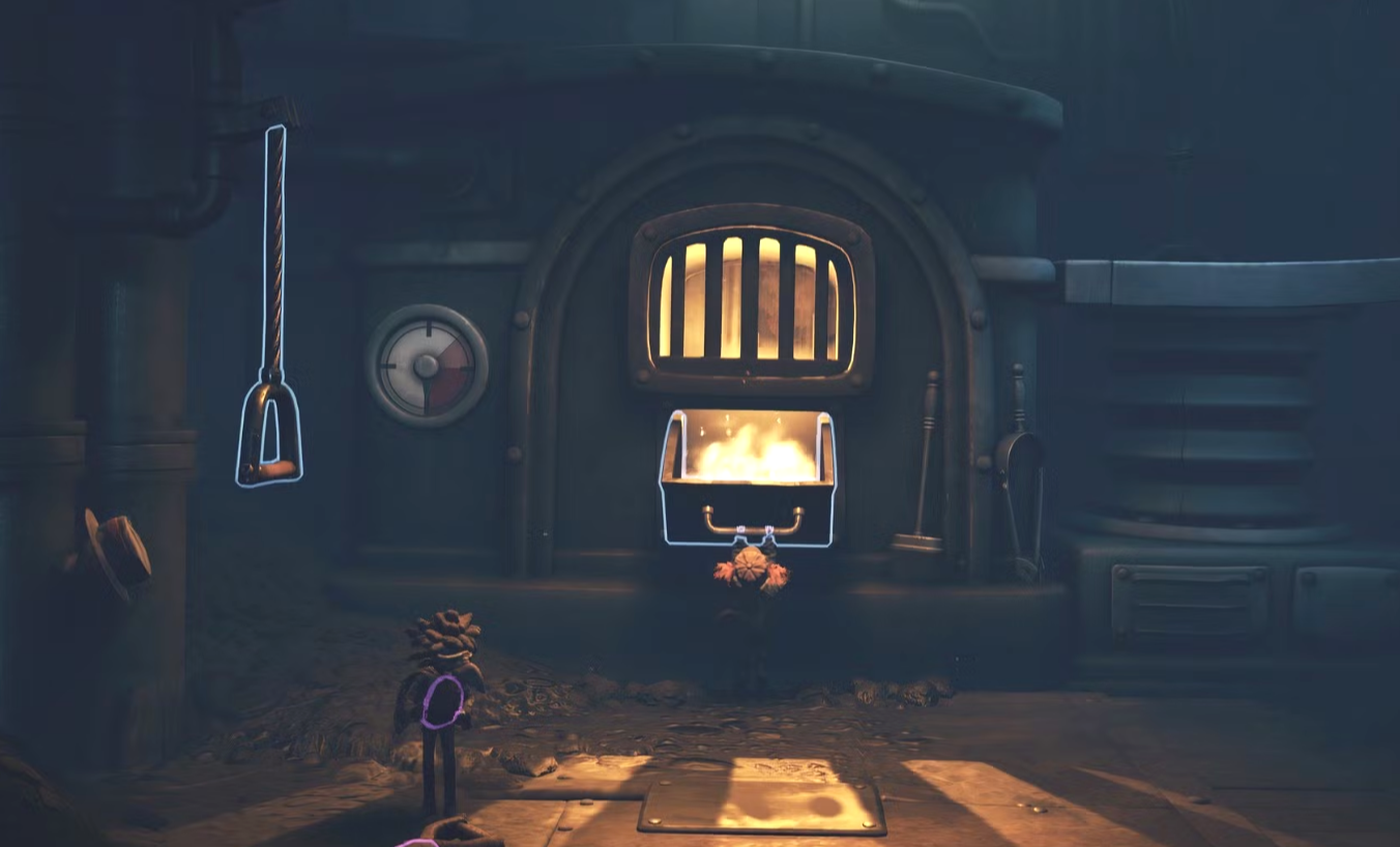 После того как пройдёте через запертую дверь, окажетесь снаружи, а затем — внутри комнаты с печью. Можете попробовать потянуть за шнурок, но это ничего не даст, так как сначала печь нужно заправить. Чтобы разжечь печь, один игрок должен удерживать дверцу печи открытой, пока другой бросает внутрь уголь. Как только будут закинуты все угли, можно будет потянуть за шнур. Вы поймёте, что угля достаточно, когда циферблат с левой стороны станет красным.