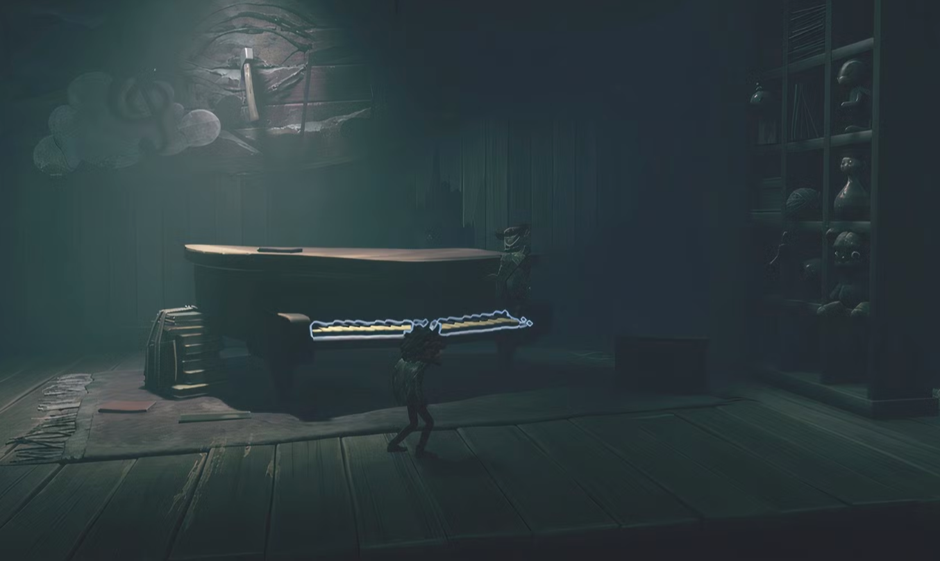 Отыскав предыдущую коллекционную куклу, вернитесь в коридор и идите в комнату в правом дальнем углу, где находится пианино. Запрыгните на клавиши пианино и пробегите по ним слева направо несколько раз, чтобы открыть секретную комнату за полкой с игрушками, где вы найдёте пятую коллекционную куклу третьей главы «Карнавал». Взаимодействие с клавишами пианино в этой комнате также разблокирует достижение «Чувство такта». Когда вы откроете секретную дверь, из неё также выбежит ном. После того, как схватите коллекционную куклу, ном спрячется за пианино. Обнимите последнего нома главы, чтобы получить достижение «Дом там, где ном».