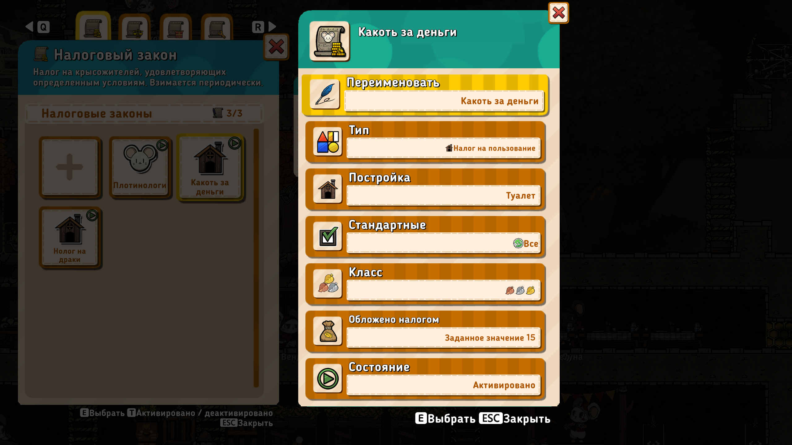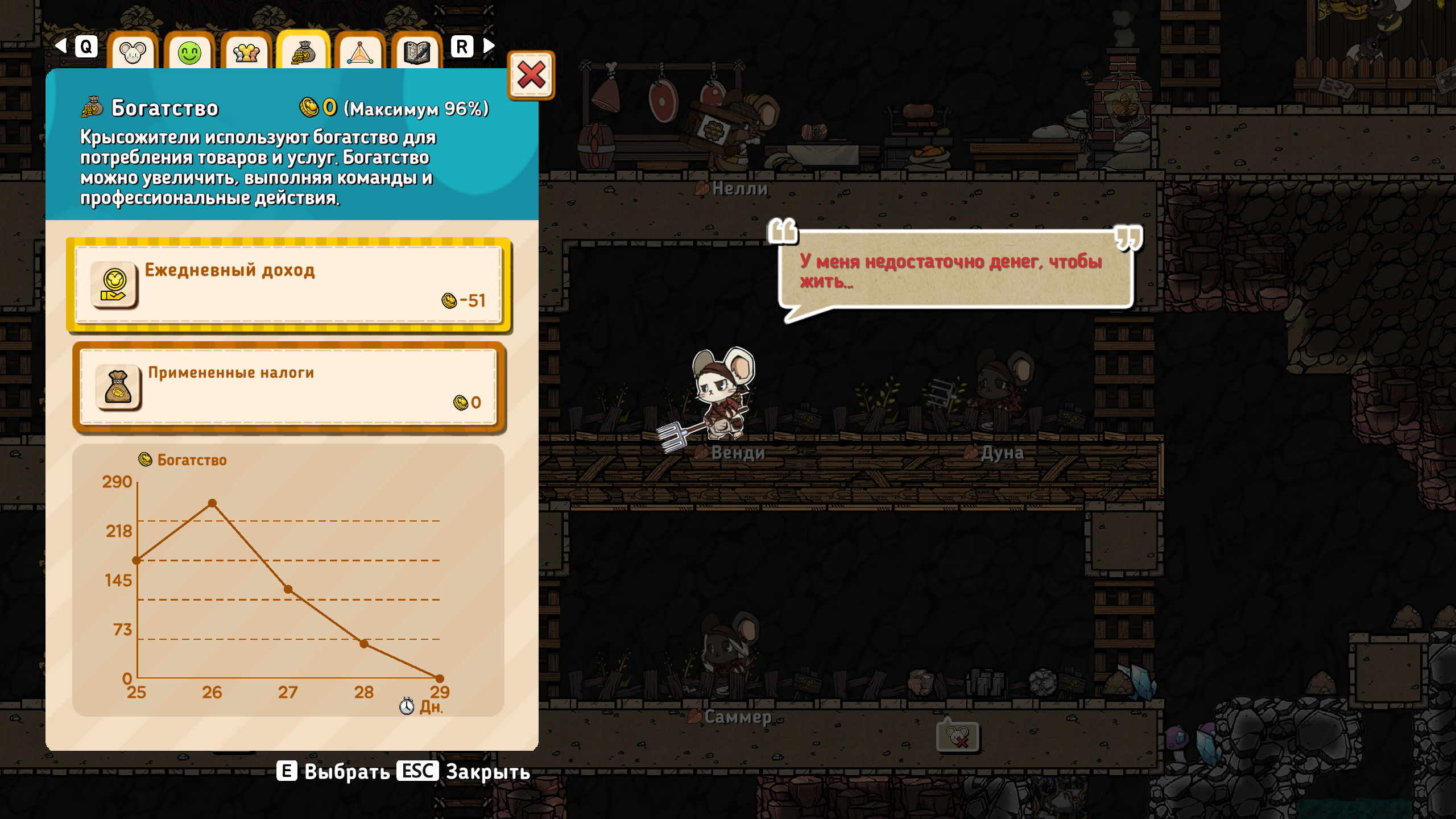К счастью, настроек для этого много. Можно взимать деньги за пользование постройками вроде туалета или цирка. Или ещё сильнее разъединить общество, повысив цены на хлеб и мясо, чтобы только богатые крысы могли позволить себе подобную роскошь. Создать район для среднего и высшего классов, оставив бедняков гнить в гетто под землёй. Главное, не слишком часто трепать нервы крысожителям — они многое могут стерпеть, прежде чем взбунтуются, но терпение рано или поздно подходит к концу.