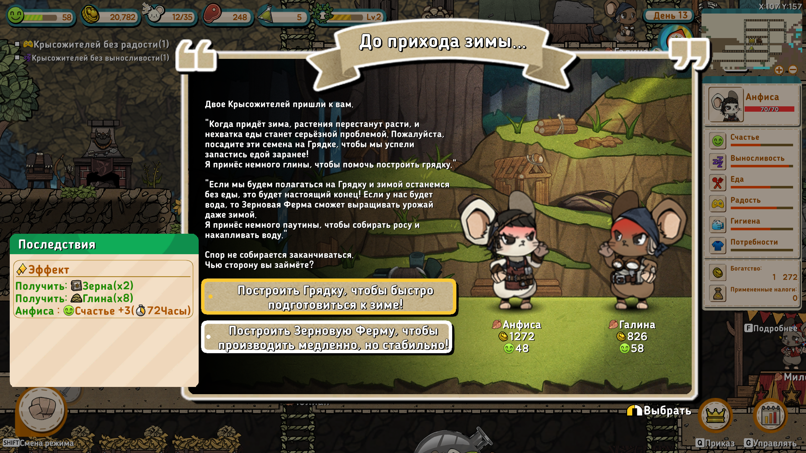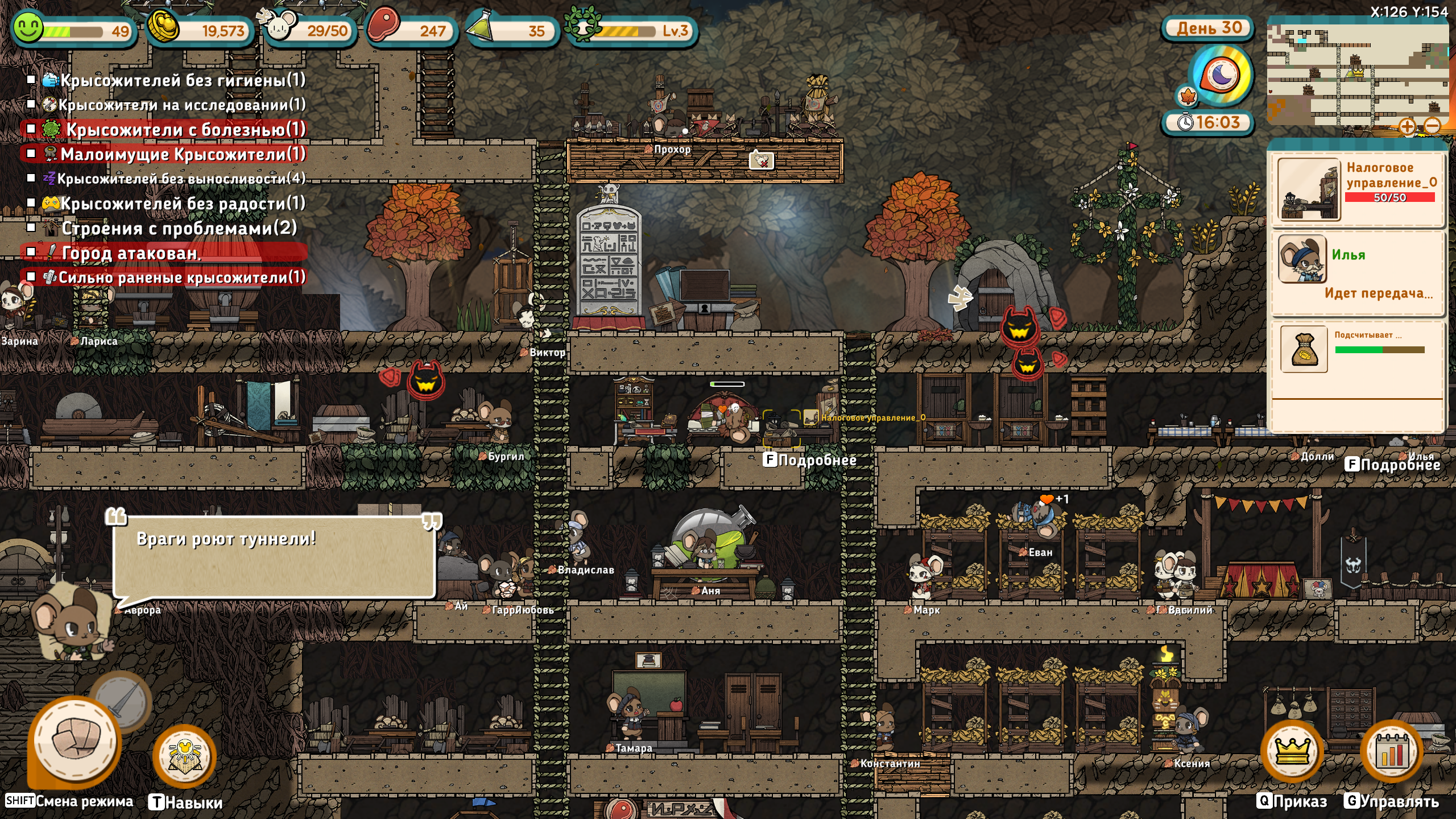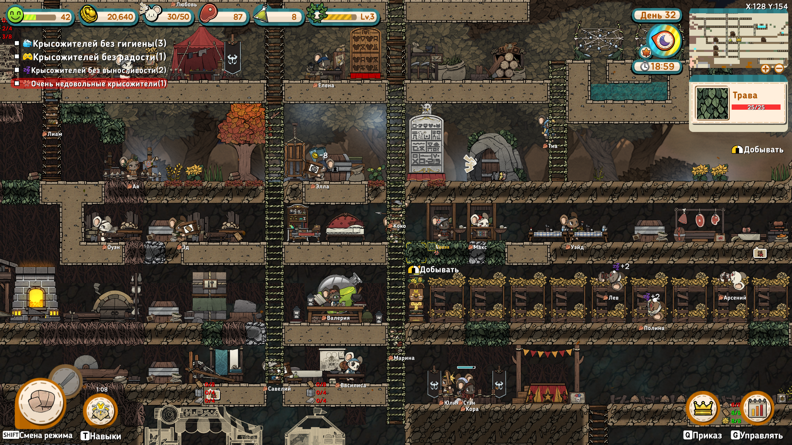 Единственный существенный недостаток игры для меня связан, пожалуй, с невозможностью максимально отдалить карту и одним глазом присматривать за поселением во время таких походов (режим камеры не в счёт). Когда дел становится слишком много, а зима близко, хочется удалённого управления, чтобы отдавать приказы крысам не будучи на базе. Конечно, со временем появятся и железная дорога, и лифт для быстрых перемещений по карте, и полицейские участки для поимки преступников, и рабочие для починки сломанных станков — но до этого момента приходится разрываться между обязанностями и микроменеджментом.