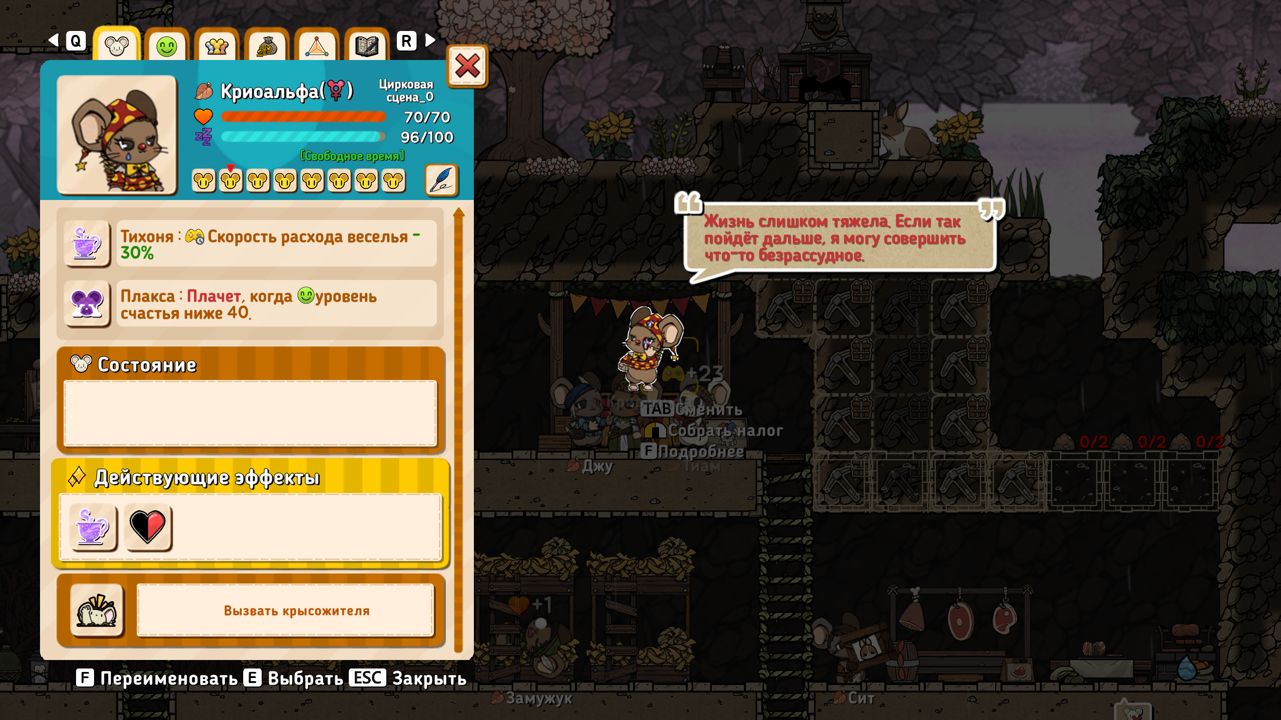 После приглашения в город каждого крысожителя можно переименовать. Я этим воспользовалась и назвала поселенцев именами своих друзей и знакомых в соответствии с их чертами характера. Сразу появилось чувство ответственности, потому что теперь это не просто будущие налогоплательщики, а почти что родные люди! А уж сколько смешных историй потом можно рассказать! Ведь крысожители — не болванчики у станков. У каждого — своё расписание и поручения, жизненные трудности, личностные конфликты, параметры довольства и квесты. Конечно, экскременты, как в Cult of the Lamb, они пробовать не захотят, но просьб будет предостаточно.