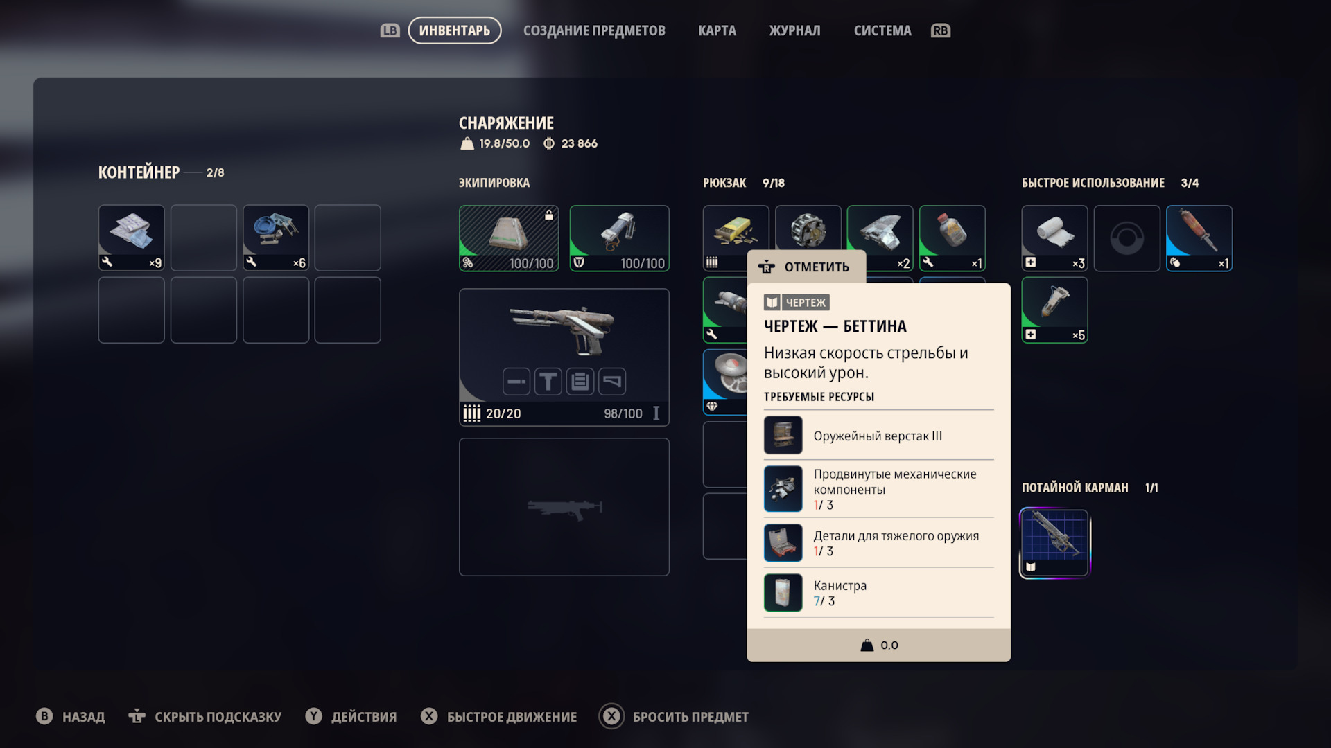 Претензии у меня возникают лишь к интерфейсу на базе. Поскольку склад очень быстро забивается собранным в вылазках хламом, рано или поздно что-то нужно продавать или разбирать на детали. Вот только игра не говорит сразу, какие детали даст та или иная вещь. Приходится нажимать на несколько кнопок, чтобы это увидеть. Также сильно не хватает кнопки «Избранное» — хотя лут разбит на категории, бинты и устройства для восстановления щитов лежат в большой куче с гранатами и минами, и при выборе экипировки выискиваешь нужное, тратя время. Ну и быстрый переход от инвентаря к верстаку не помешал бы — например, чтобы сразу создавать патроны для надетого оружия.