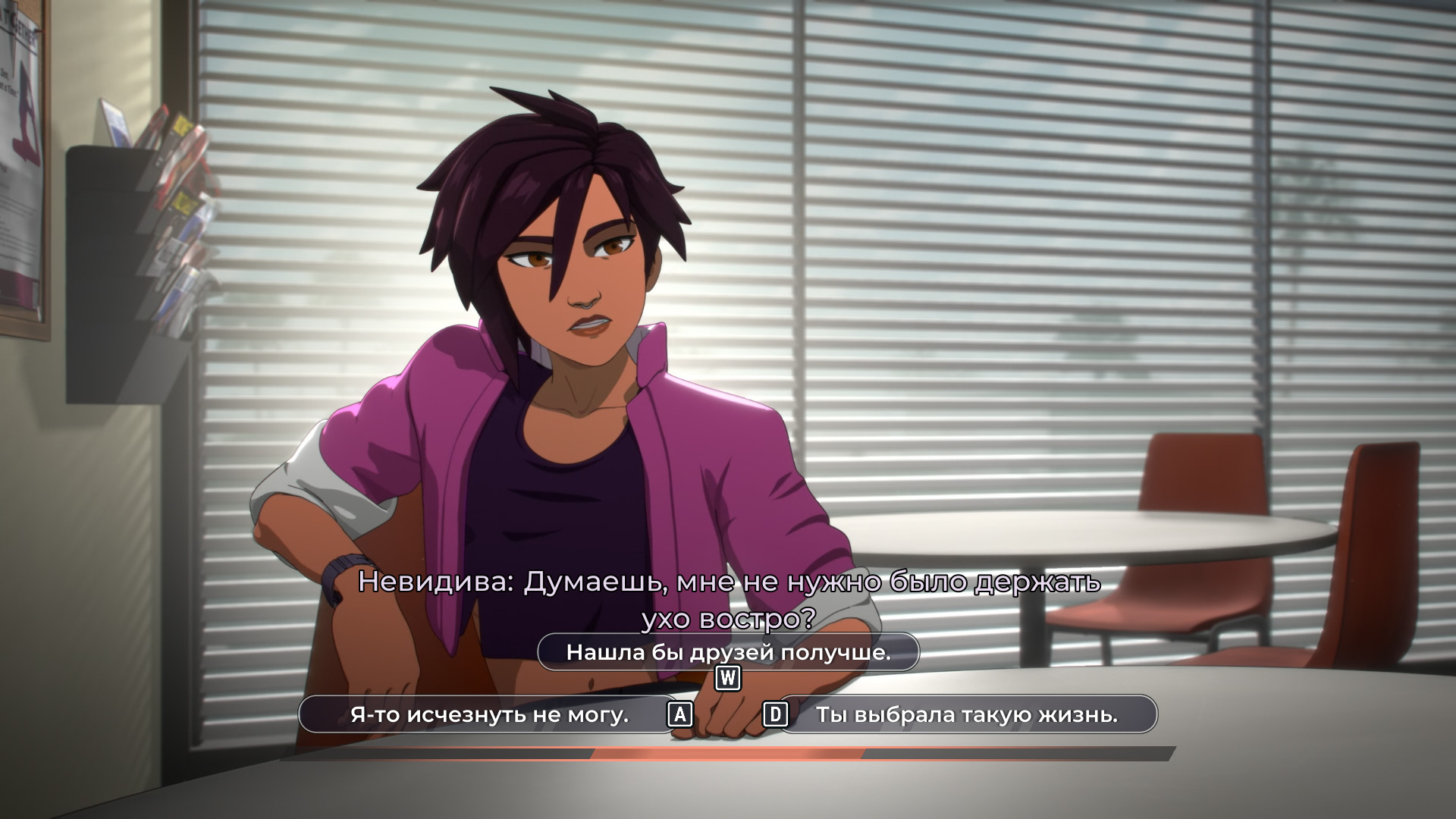 Когда знаешь всю эту предысторию, лучше понимаешь свои эмоции, возникающие во время прохождения Dispatch. С одной стороны, новинка действительно похожа на лучшие игры Telltale и качеством сценария, и некоторыми геймплейными «фишками» — по надписи в углу, сообщающей, что такой-то персонаж «запомнит это», я успел соскучиться. С другой — в сюжетных сценах проект похож на интерактивный фильм гораздо больше, чем «Ходячие» и всё остальное, поскольку свободного перемещения по локациям здесь нет. Игра представляет собой набор из множества заранее записанных роликов, и авторы очень умело это маскируют, создавая впечатление, будто видишь сцены на движке. В то же время и для геймплея нашлось место — и он лучше всего, что предлагала Telltale.