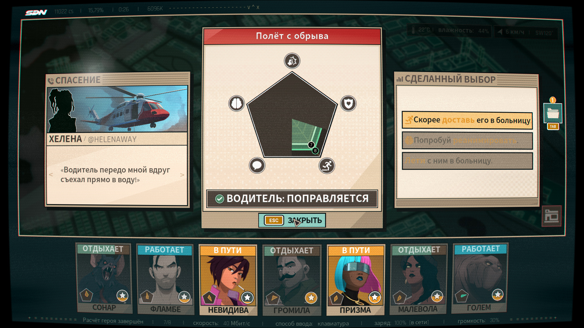 Ещё у каждого персонажа есть уникальные особенности — у одного меняются характеристики после каждой смены, другой лечит раненых союзников, третий быстрее передвигается по карте в одиночку и так далее. А ещё время от времени позволяют отправлять героев на тренировку, где они обучаются новым навыкам, которые делают их ещё эффективнее. В общем, диспетчерская работа оказывается очень продуманной и многослойной — не буду рассказывать все детали, но новые механики вводятся чуть ли не в каждом эпизоде.
