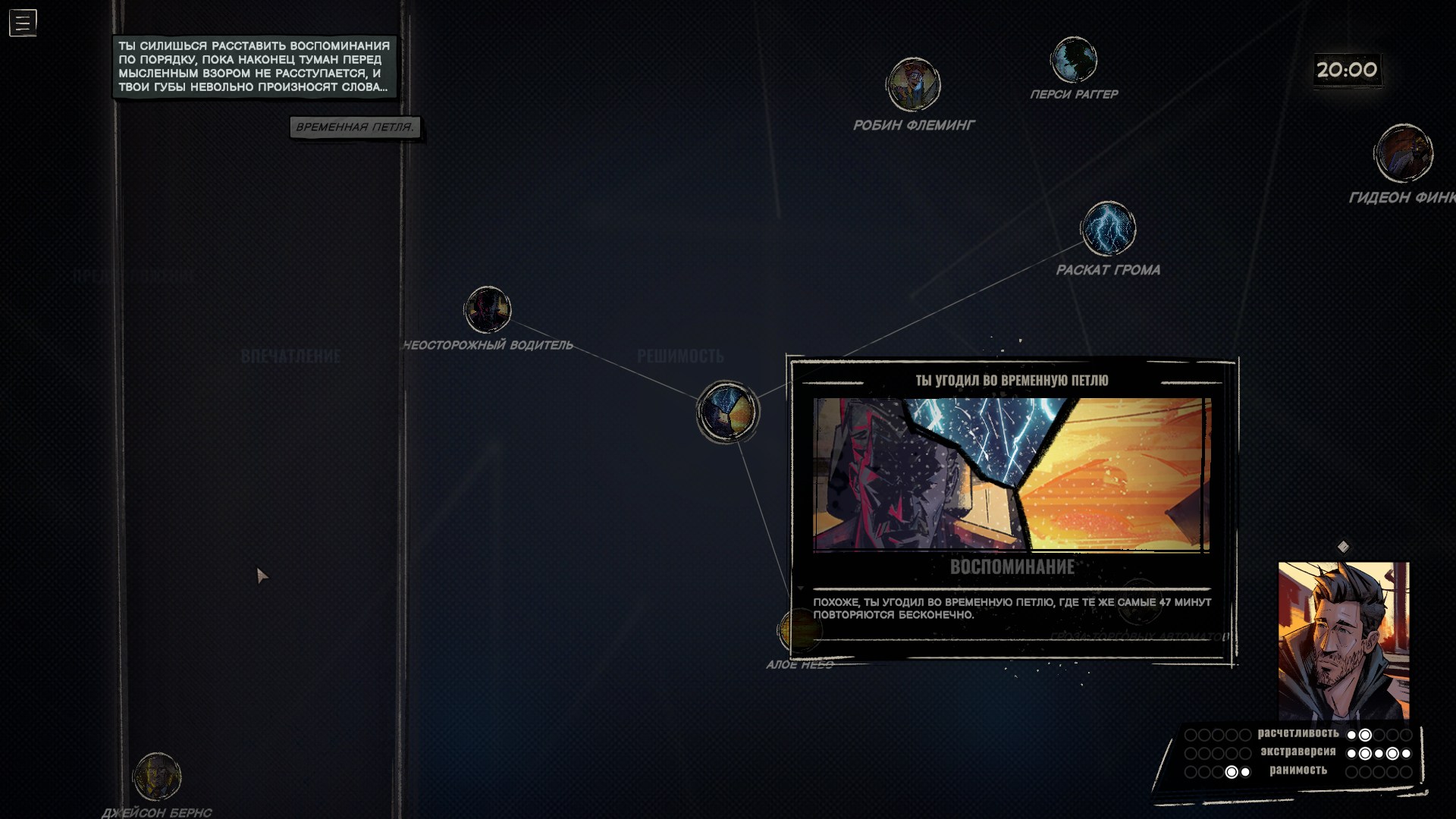 Сходство Rue Valley и Disco Elysium очевидно — изометрия, главенство текста, отсутствие сражений и, мягко говоря, не очень счастливый мужчина в главной роли, у которого разные, в том числе психологические, проблемы. На сей раз мы играем за Юджина Хэрроу, которого после нервного срыва отправили на принудительную психотерапию в захолустный городок. А в итоге он попал в «День сурка», который длится всего 47 минут. И за это время нужно понять, как разорвать петлю времени.