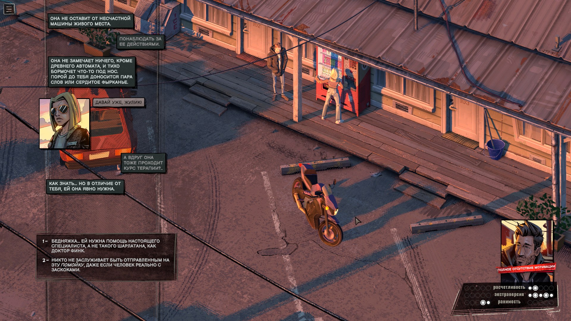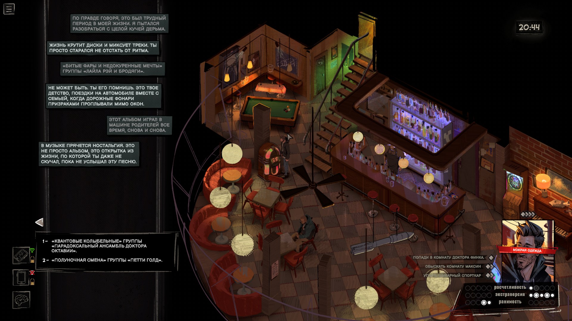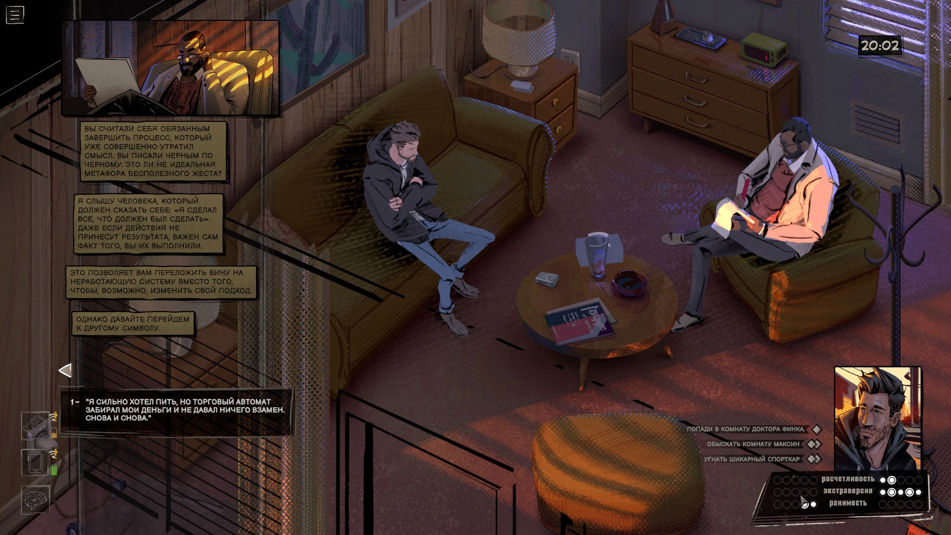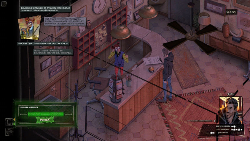 Проверки и состояния тоже редко участвуют в геймплее. Ну да, в начале игры я выпил виски, найденный у доктора, и это сделало героя более разговорчивым. Пару раз выиграл, а пару раз провалил проверки, не подозревая, что местная система устроена извращённым образом — чем больше вложили очков в ту или иную черту личности, тем меньше шансов, что связанная с ней проверка пройдёт успешно. В любом случае я толком не заметил, чтобы это на что-то серьёзно влияло, да и встречаются такие ситуации редко.