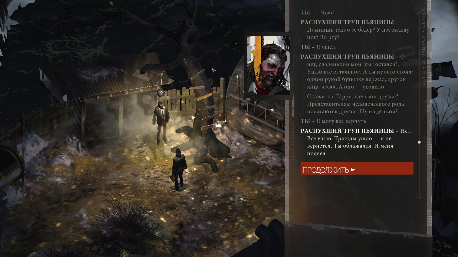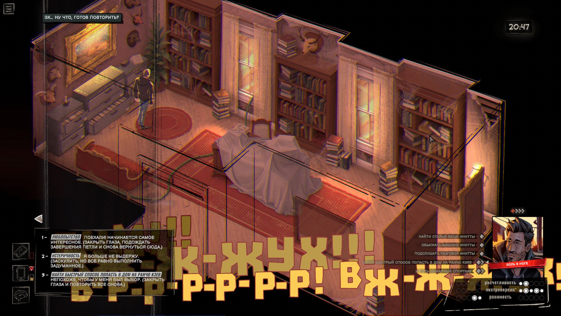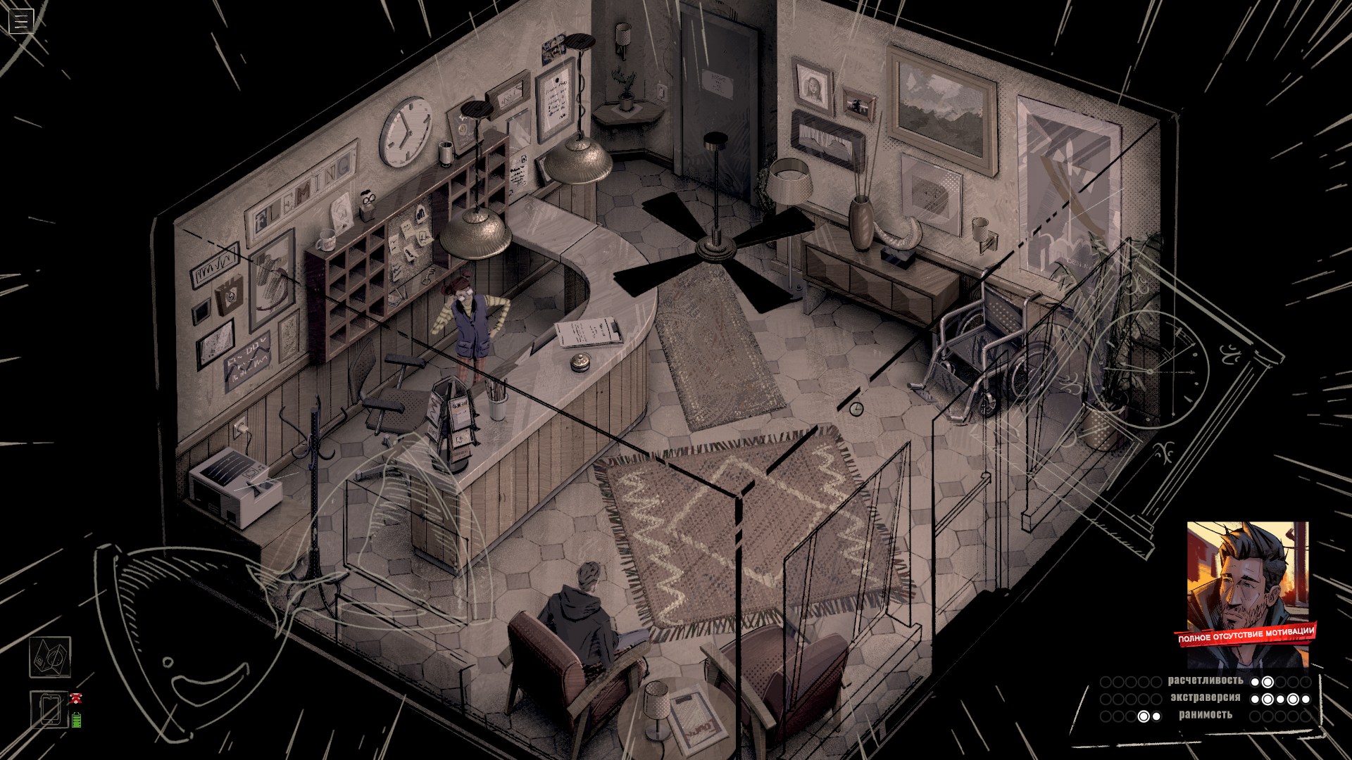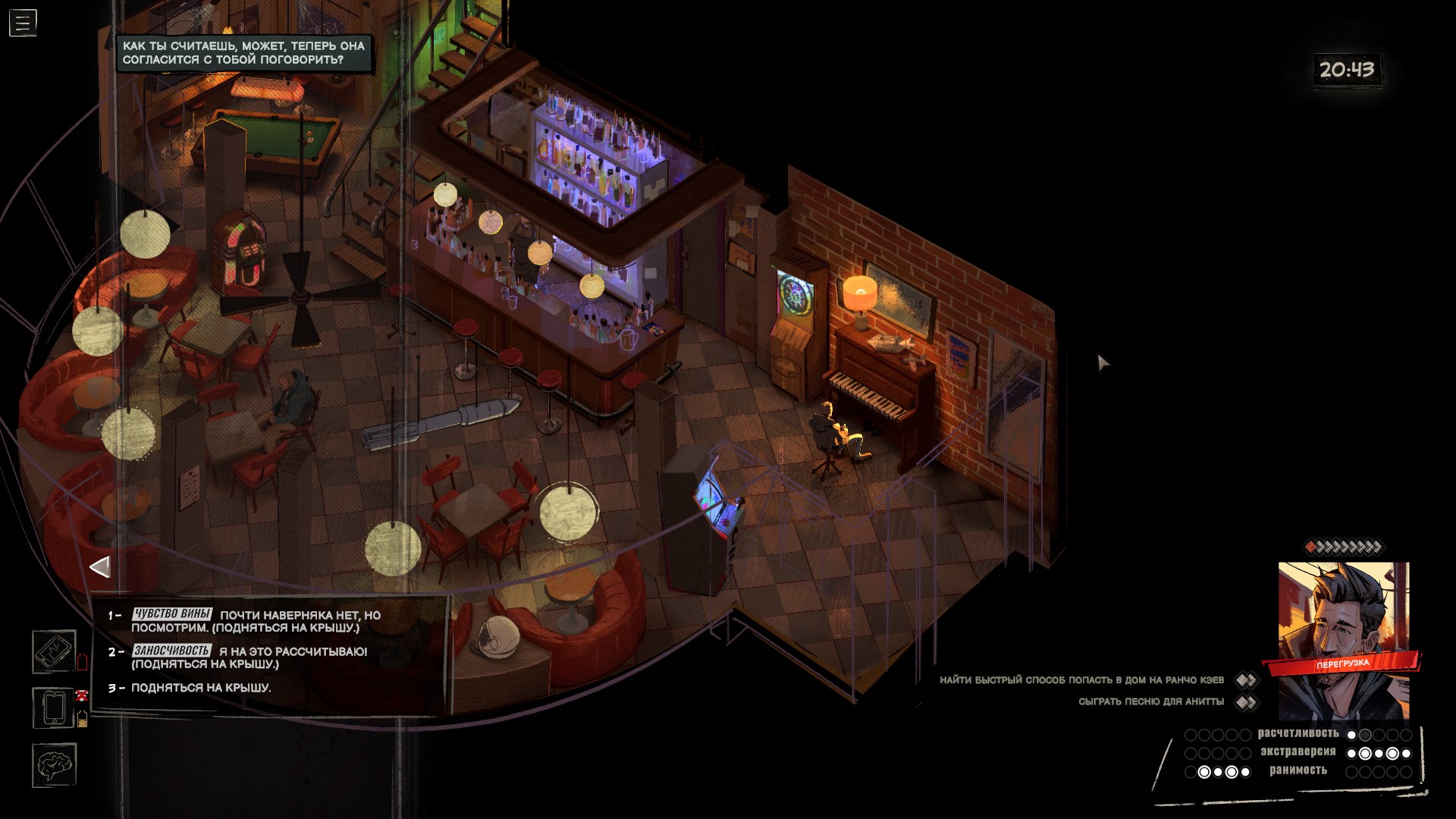 Проверки и состояния тоже редко участвуют в геймплее. Ну да, в начале игры я выпил виски, найденный у доктора, и это сделало героя более разговорчивым. Пару раз выиграл, а пару раз провалил проверки, не подозревая, что местная система устроена извращённым образом — чем больше вложили очков в ту или иную черту личности, тем меньше шансов, что связанная с ней проверка пройдёт успешно. В любом случае я толком не заметил, чтобы это на что-то серьёзно влияло, да и встречаются такие ситуации редко.