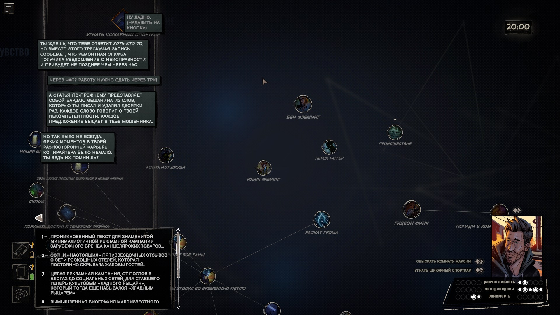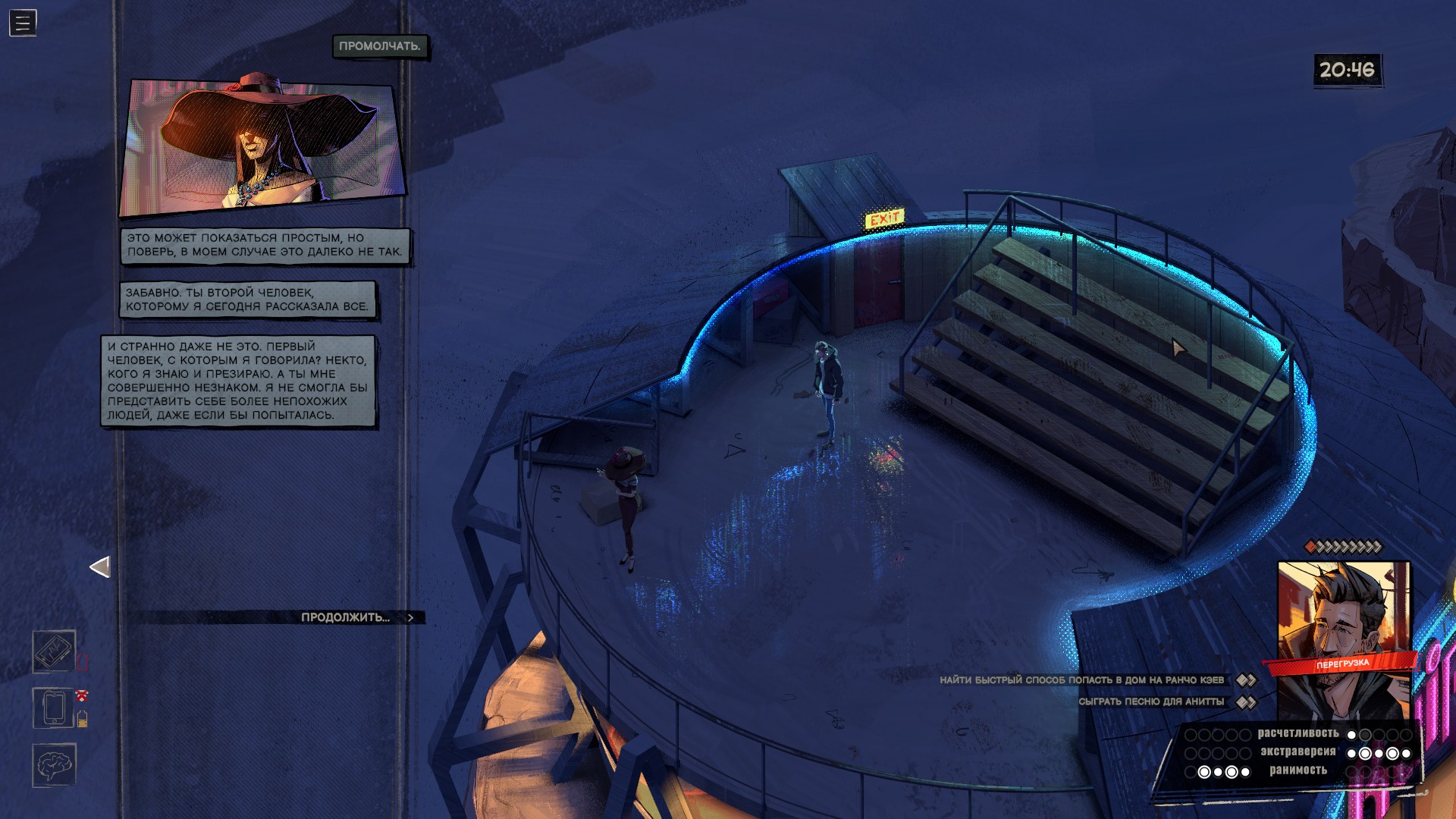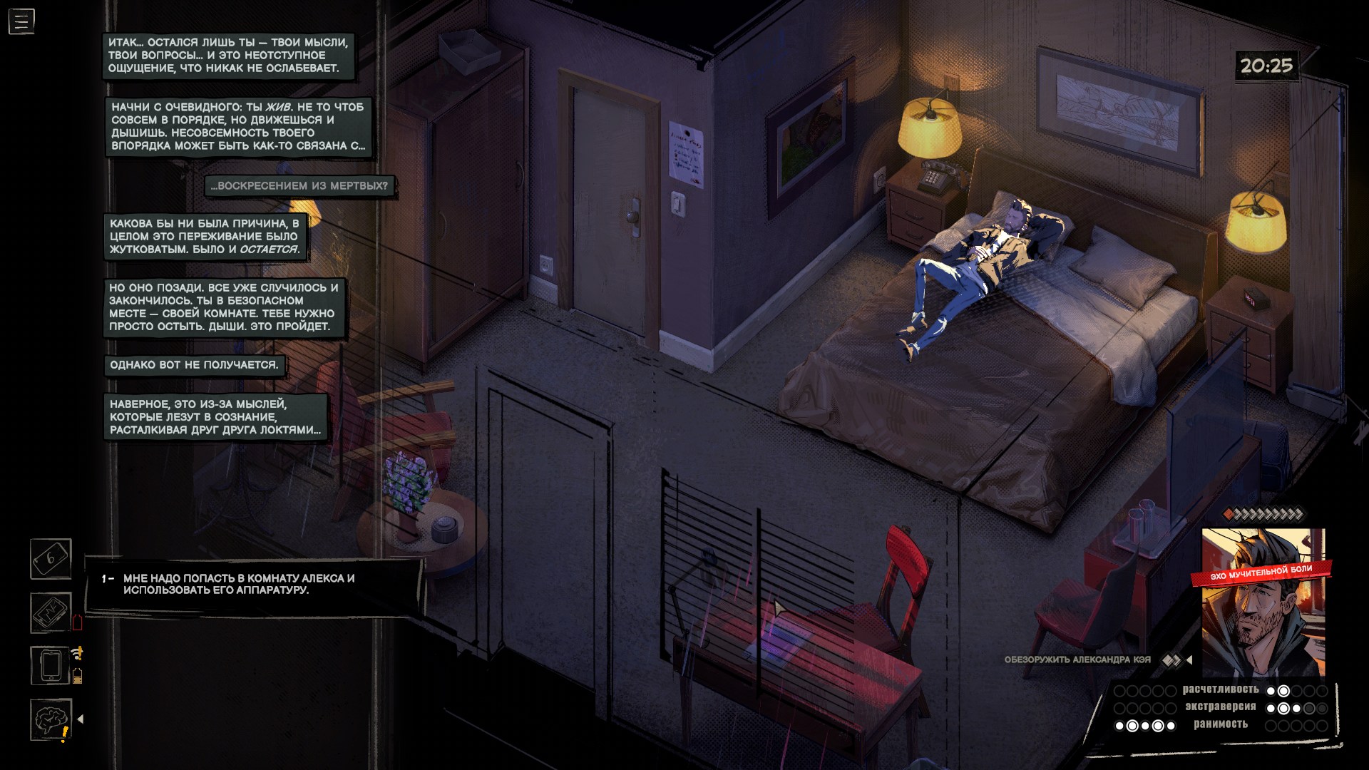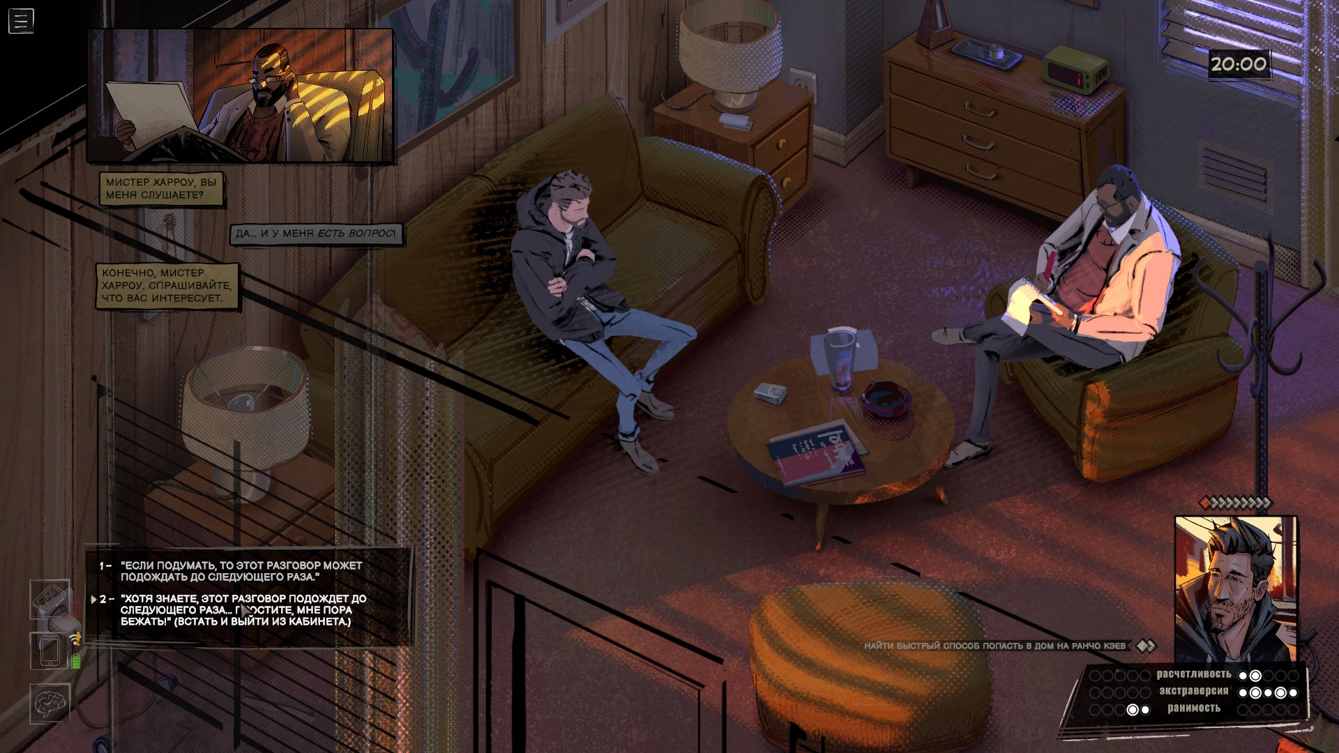 Проверки и состояния тоже редко участвуют в геймплее. Ну да, в начале игры я выпил виски, найденный у доктора, и это сделало героя более разговорчивым. Пару раз выиграл, а пару раз провалил проверки, не подозревая, что местная система устроена извращённым образом — чем больше вложили очков в ту или иную черту личности, тем меньше шансов, что связанная с ней проверка пройдёт успешно. В любом случае я толком не заметил, чтобы это на что-то серьёзно влияло, да и встречаются такие ситуации редко.