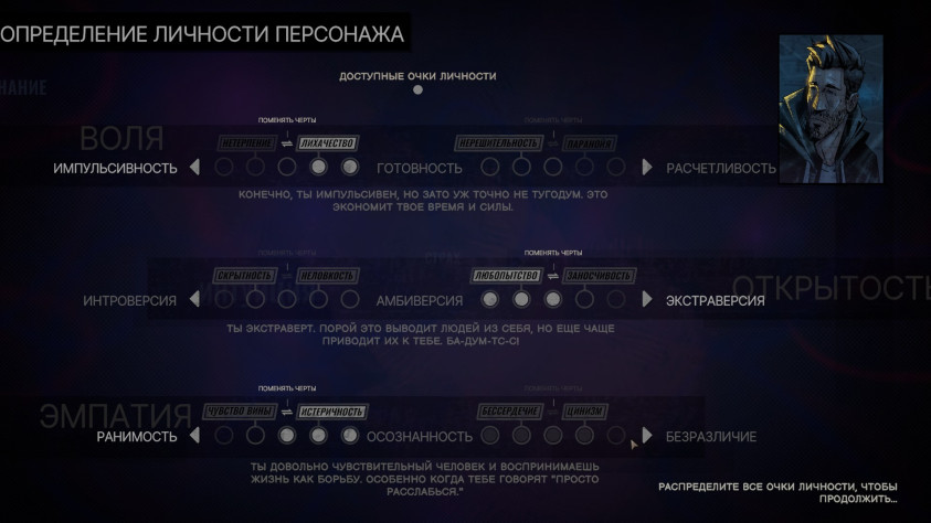 Разнообразить всю эту тягомотину и сделать геймплей нелинейным должна была фирменная система характеров и состояний. На старте мы формируем личность своего персонажа, двигая ползунки влево-вправо и делая его импульсивным или расчётливым, интровертом или экстравертом, ранимым или безразличным. Это даёт разные черты характера и открывает соответствующие реплики. Так, чем более расчётливый будет ваш Юджин, тем больше он станет проявлять паранойю и нерешительность.