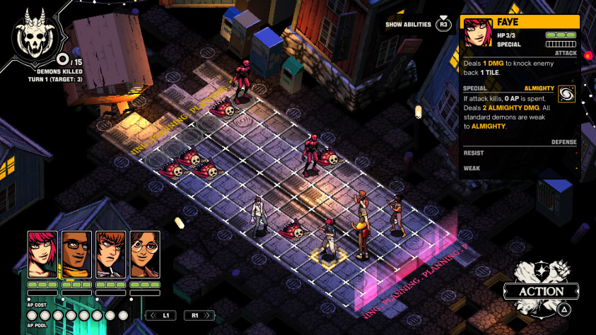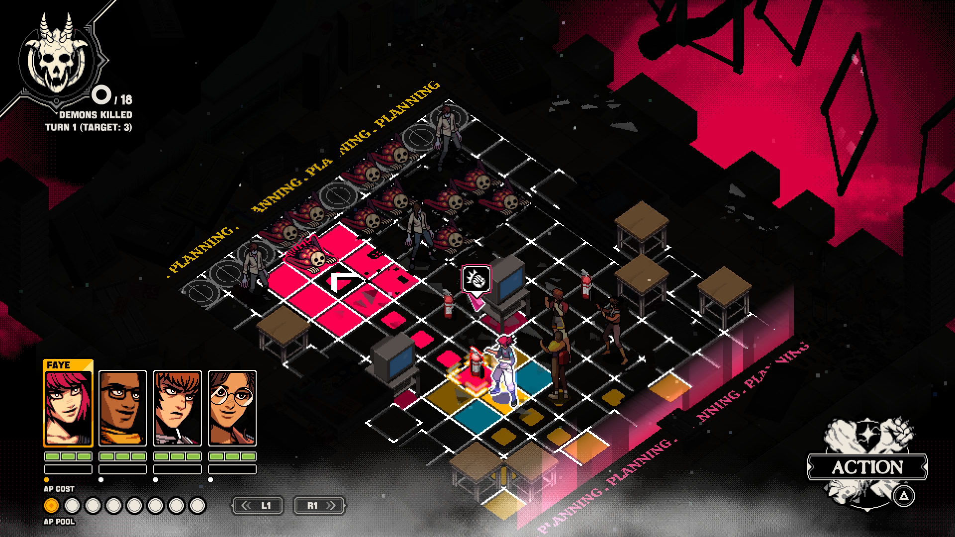 Каждая драка начинается со стадии планирования — мы расставляем своих персонажей по ячейкам, а затем определяем, кто из них что будет делать. Главное ограничение — все наши бойцы могут передвигаться и атаковать только в восьми направлениях. На все действия дают восемь очков, но они не равны восьми атакам или движениям. Первое действие каждого героя стоит одно очко, второе — два и так далее. Так что нередко приходится решать, так ли необходимо в третий раз ходить одним и тем же персонажем. Тем более что не все бойцы, по крайней мере поначалу, напрямую наносят урон врагам. Лекарь Нут восстанавливает союзникам здоровье, а тем, у кого оно полное, повышает урон. Намако же умеет проходить сквозь оппонентов, понижая их защиту и оглушая.