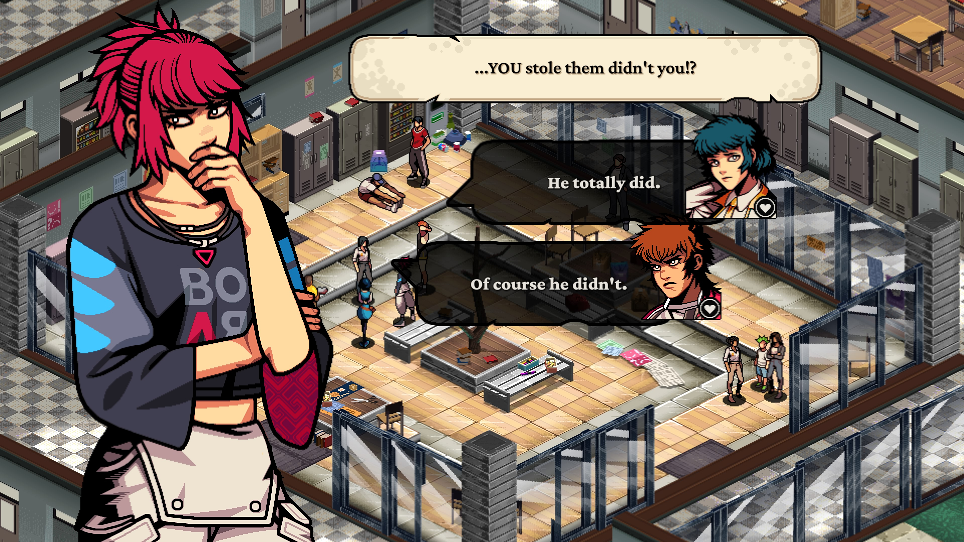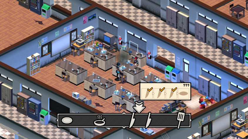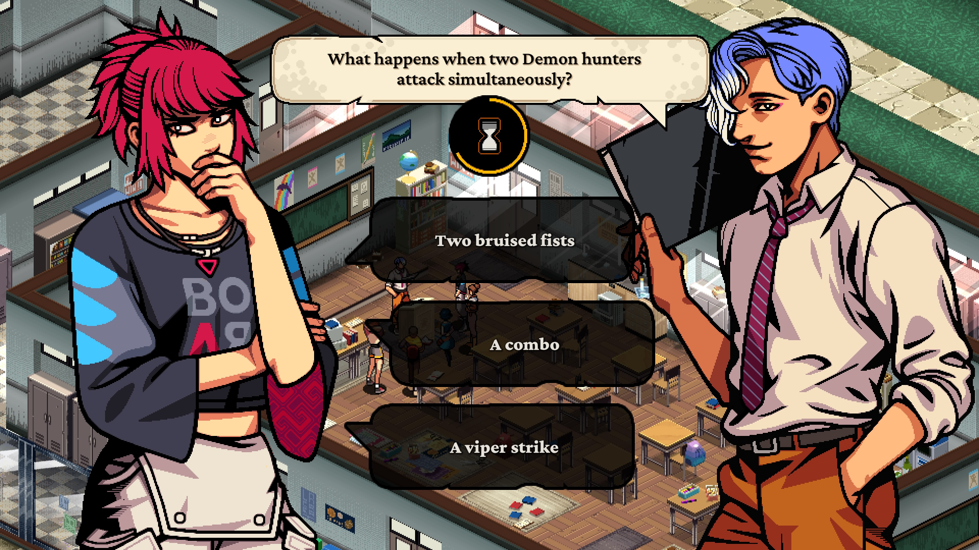 Несерьёзность отражается и в геймплее. В тех же «Персонах» нам дают столько-то дней на подготовку к битве с боссом и постоянно приходится делать выбор, чем заняться. Если решишь днём встретиться с одним персонажем, то провести время с другим (или вообще заняться ещё чем-то) удастся только завтра. В Demonschool же таких ограничений почти нет — утро сменяется ночью, дни идут, но вы, пока не запустите следующий сюжетный эпизод, вольны делать что угодно: сходить в караоке-бар и улучшить отношения с товарищем, покопаться в мусоре и найти украшения для своей комнаты, выполнить короткие побочные задания, кинуть монетку в фонтан, погладить собаку… В меню быстрого перемещения видны все доступные активности, и можно перепрыгивать с одной на другую, не боясь что-то упустить.