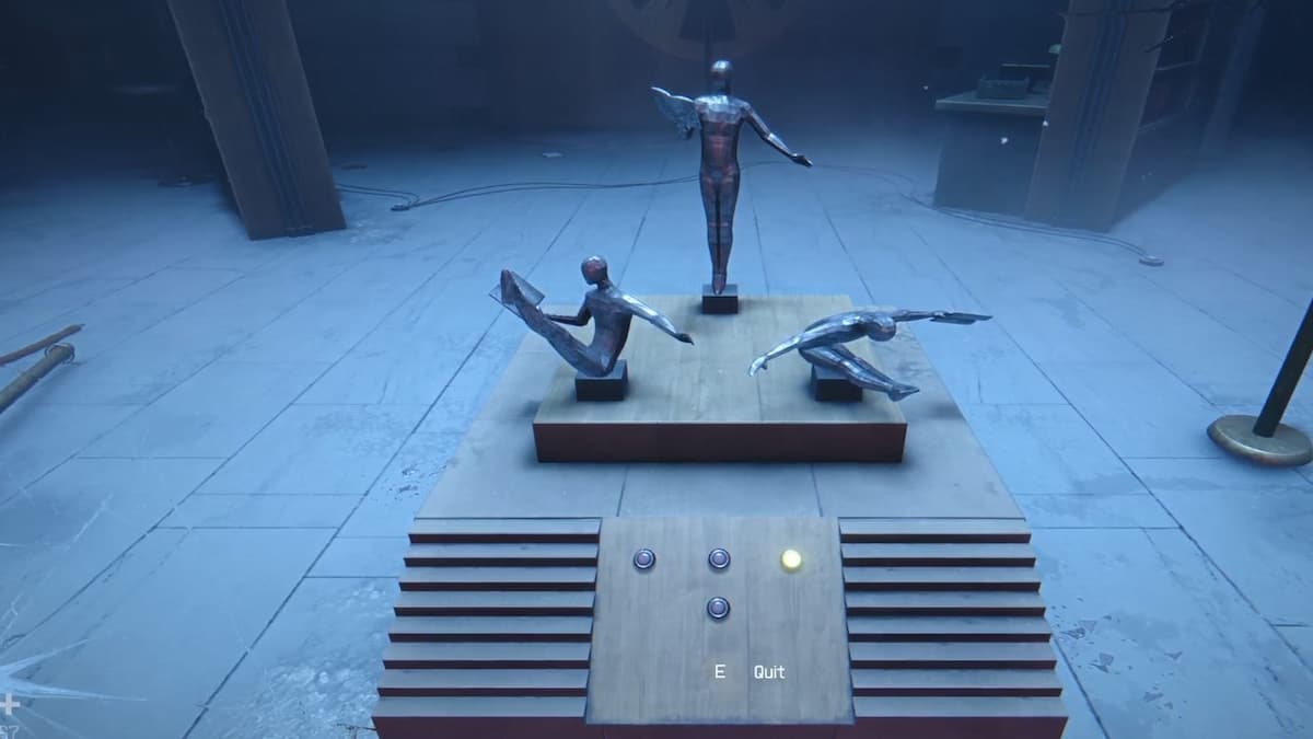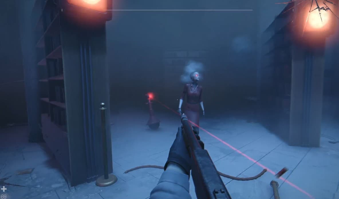 Когда будете готовы, пройдите через дверь с левой стороны. За углом обнаружите маленький красный ящик с замком. Чтобы его открыть, завершите мини-игру: нажимайте на клавишу E, когда точка совпадает с метками на кругах. Внутри находится медицинский шприц. Продолжите путь через следующую дверь и войдите в библиотеку. Подойдите к пьедесталу, на котором установлены три статуэтки — здесь начнётся схватка с боссом.