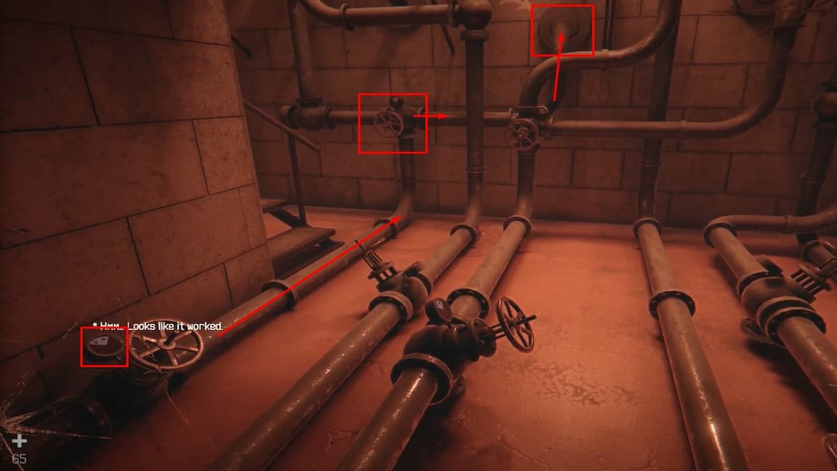 Вернитесь обратно к первому набору эскалаторов — туда, где ранее обнаружили терминал. Неподалёку, за поворотом с левой стороны есть дверь, ведущая в насосную. Внутри необходимо отрегулировать систему управления трубам таким образом, чтобы вода текла только по нужной линии, отмеченной «белой стрелкой». Все остальные трубы следует перекрыть: поворачивайте каждый доступный вентиль до тех пор, пока не исчезнут красные индикаторы (без красных точек). Не забудьте подняться по лестнице с левой стороны — наверху размещён ещё один вентиль, который нужно перекрыть.